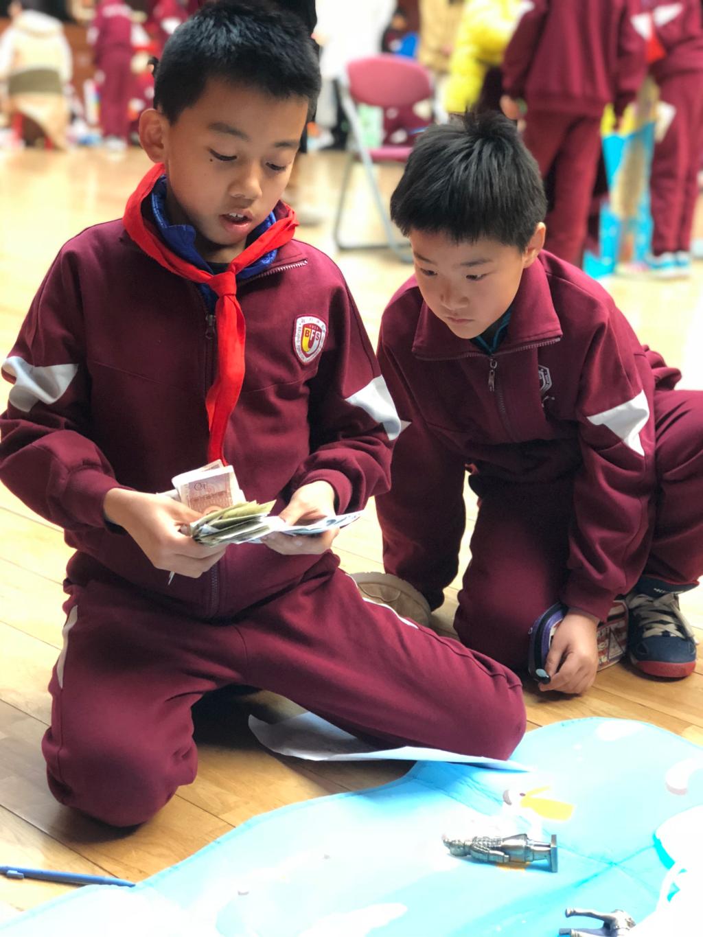 三年级10个班全体学生参加了此次活动,每个班级均设立了自己的摊位。为方便兑换钱币,学生们设立了外附银行。