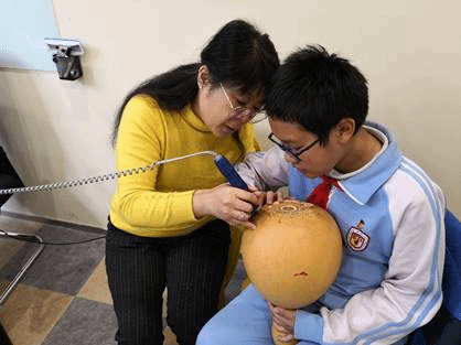 葫芦雕刻是本年度新引入的非遗课程,我校有幸请来马江红教授为学生授课。马江红老师被誉为“中国葫芦壁画雕刻第一人”。马老师经过30多年的潜心研究,精雕细琢,形成了一门独特的工美艺术——葫芦壁画。葫芦壁画雕刻作品完美地复活了敦煌壁画和新疆克孜尔石窟壁画。在马老师的带领下,我校初中学生在学习传统技艺的基础上能进一步提升自己的审美情趣,陶冶涵养品性。对于非物质文化遗产来讲,传承是关键。以非遗选修课为契机,我校的中学生有责任也有义务,将中华非物质文化遗产传承并发扬光大。