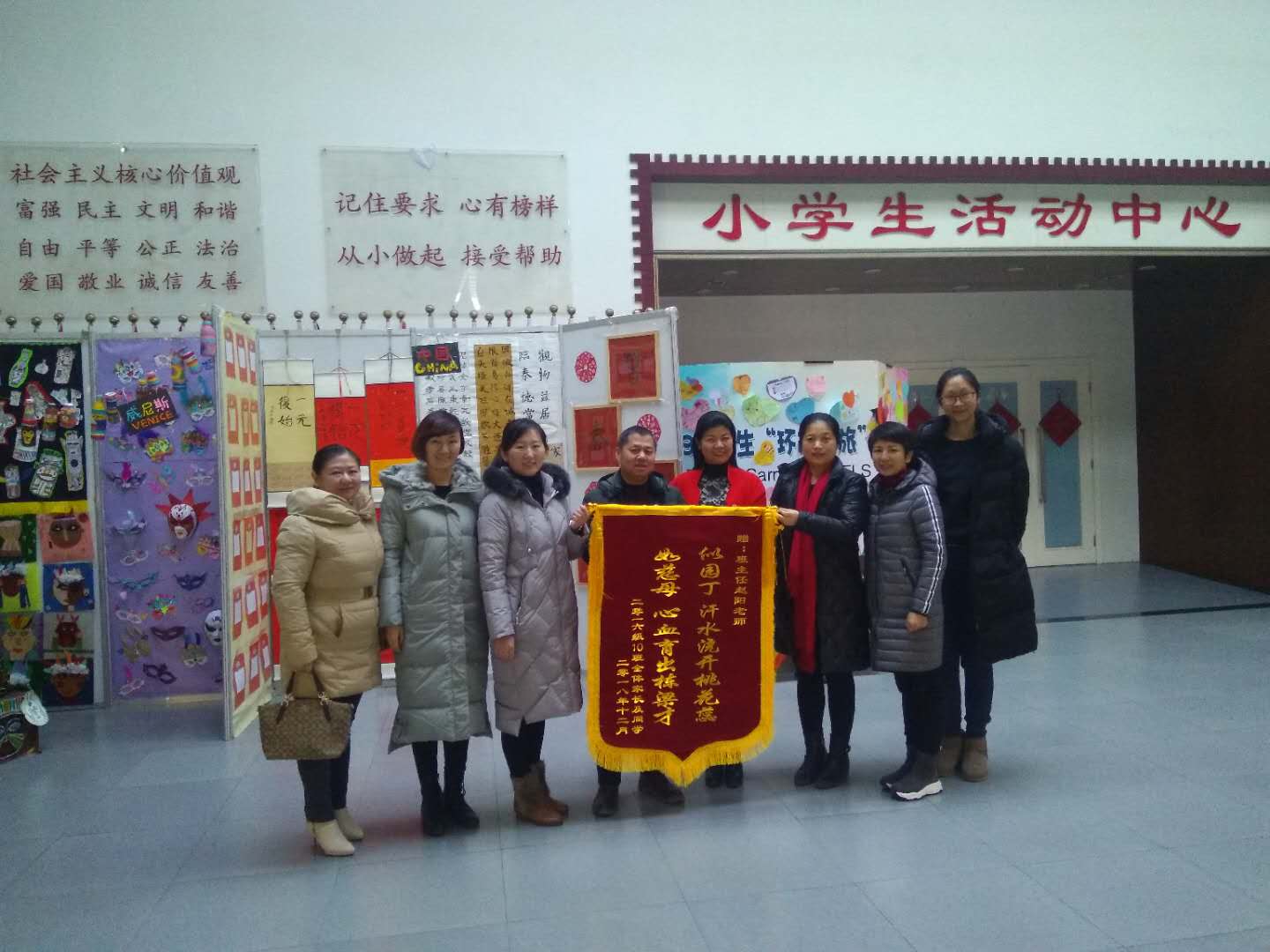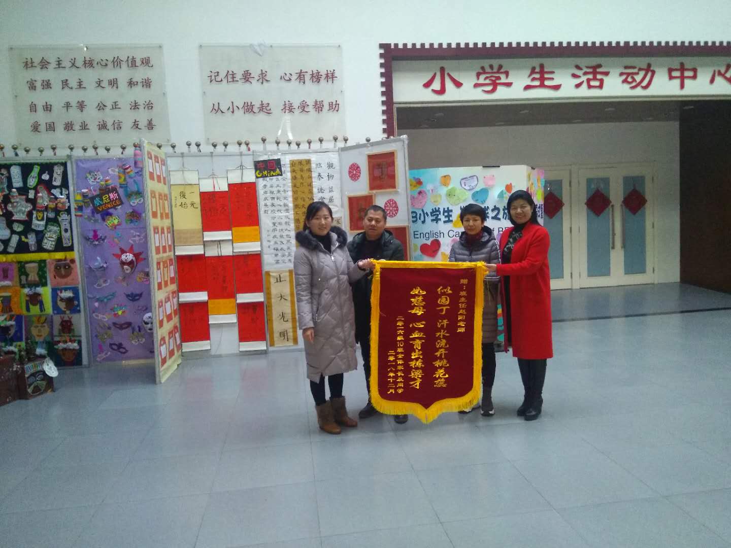 近日,在寒风凛冽的冬日里,我校小学三年级十班的家长代表们为班主任赵阳老师送来了锦旗,小学执行校长刘宏利和副校长李琳热情的接待了家长。