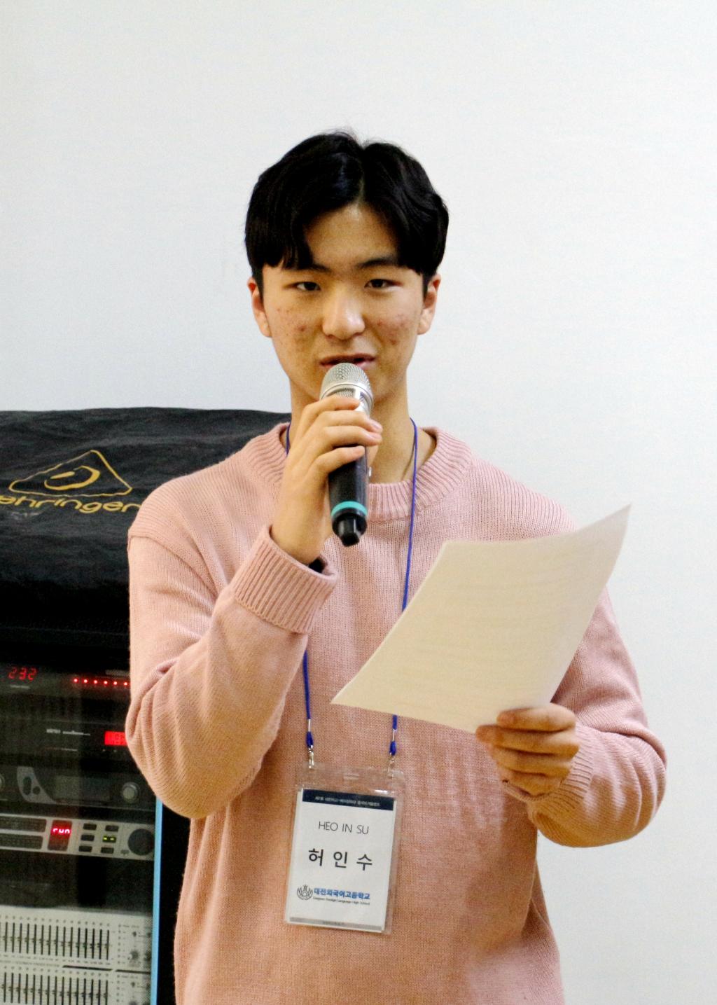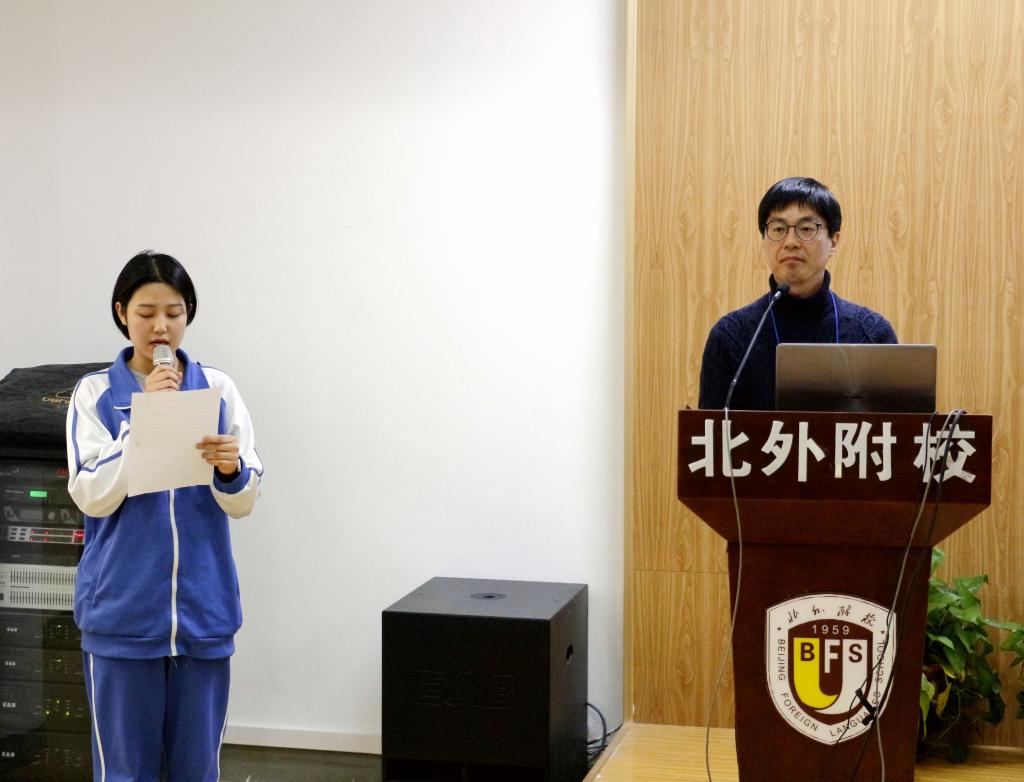 大田外国语高中国际部李主任对我校的热情欢迎表示感谢,同时感谢学校尽心安排的参观颐和园活动,让他们对中国的悠久的历史有了更深的感悟。我校韩语班的同学担任大田外国语高中部李主任的翻译。