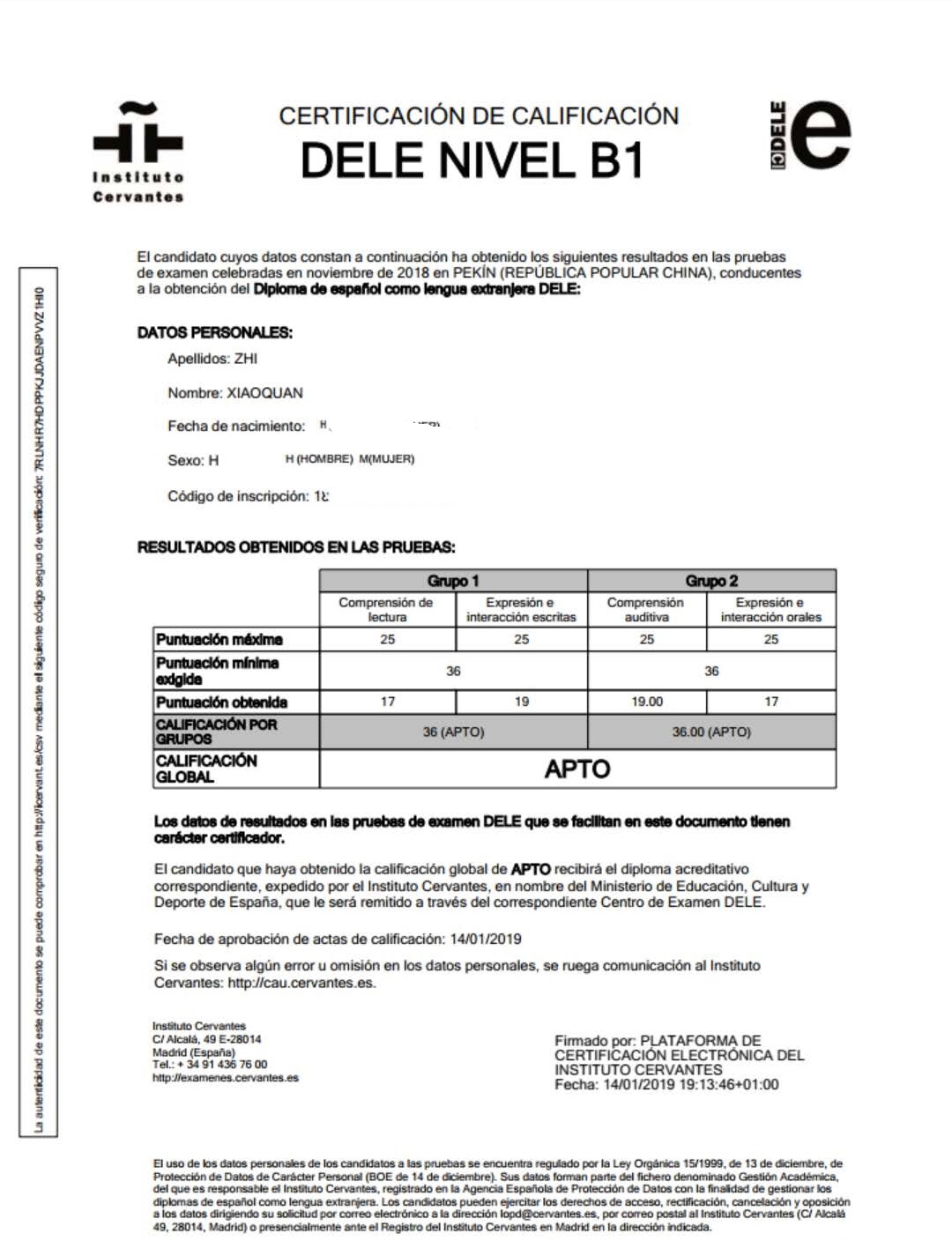 2018年11月9日,我校初三六班西语班的学生在高榕一老师的带领下参加了DELE A2-B1西班牙语水平测试,取得了优异成绩。本次考试报考DELE A2通过率100%。其中,智小泉同学通过了B1级别水平测试。特此祝贺!