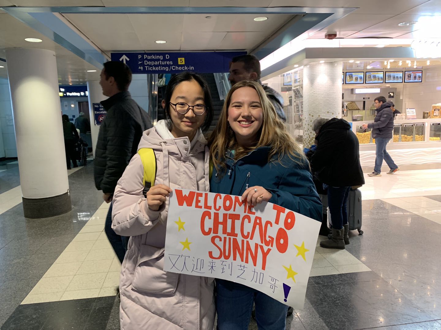 虽然芝加哥正值隆冬,但中国师生刚一落地就感受到了美国姐妹校和寄宿家庭满满的热情。寄宿家庭全家和姐妹校的2位教师已经提前2个小时在机场等候,他们为我们这些远道而来的客人献上了欢迎的鲜花和气球。