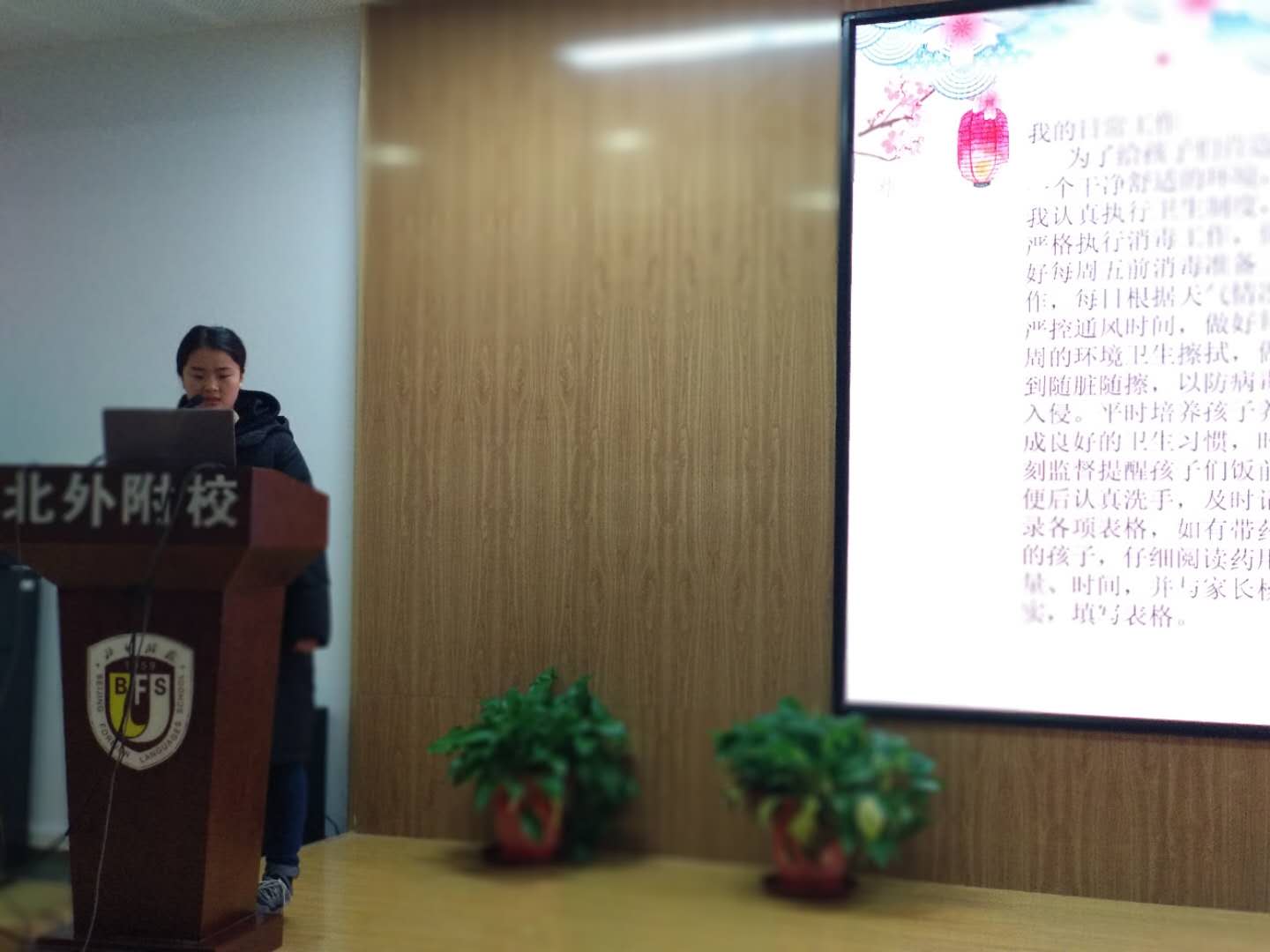 各组教师代表依次对本学期工作作总结、汇报。学前班崔丽娟老师从“七步洗手法”“用餐的正确姿势、行为、营养配餐”,“叠衣挽袜的方法、拉拉链,扣扣子,系鞋带”等生活技能的培养等低龄段孩子需要掌握的技能作出了展示,崔老师的总结图文并茂,真实生动地反映了学前组老师们的辛勤工作及可喜的成果。