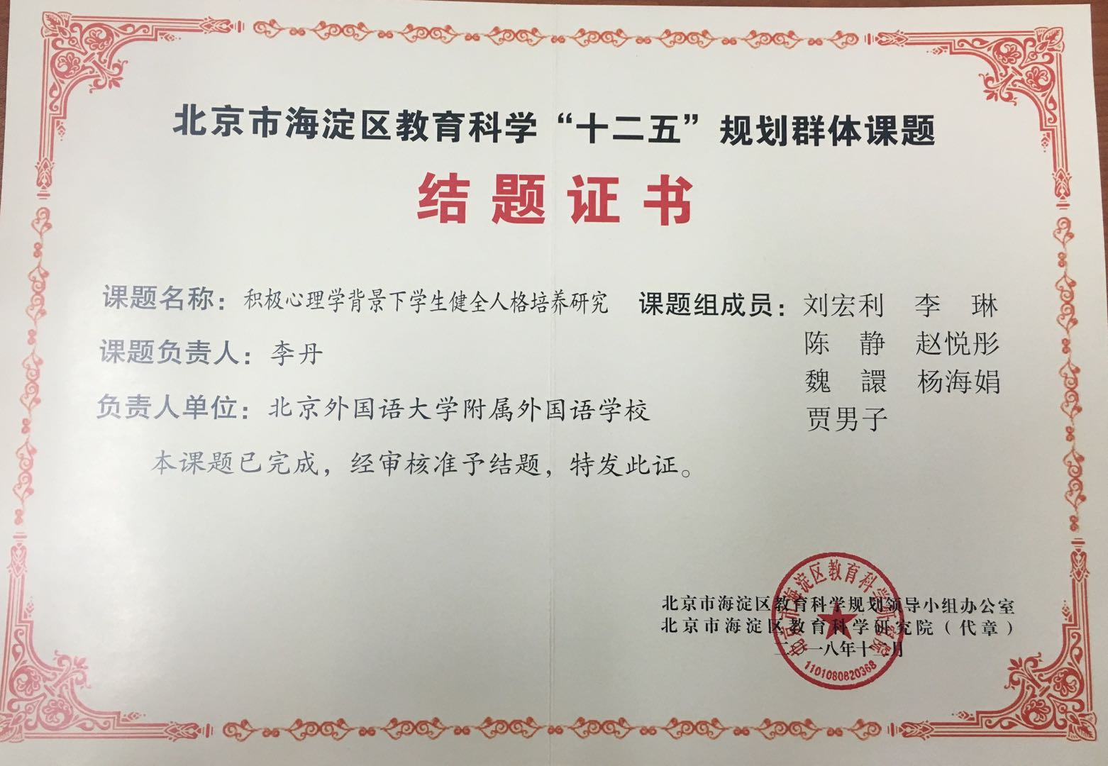 1月22日,海淀区教科院“十二五”教育规划群体课题“积极心理学背景下健全人格培养研究”课题总结会在教科院四层阶梯教室举行,我校承担的子课题《积极心理学导向的心理社团构建模式在培养学生健全人格实践中的应用研究》顺利结题并获得结题证书,我校心理教师李丹被评为“课题研究优秀教师”。