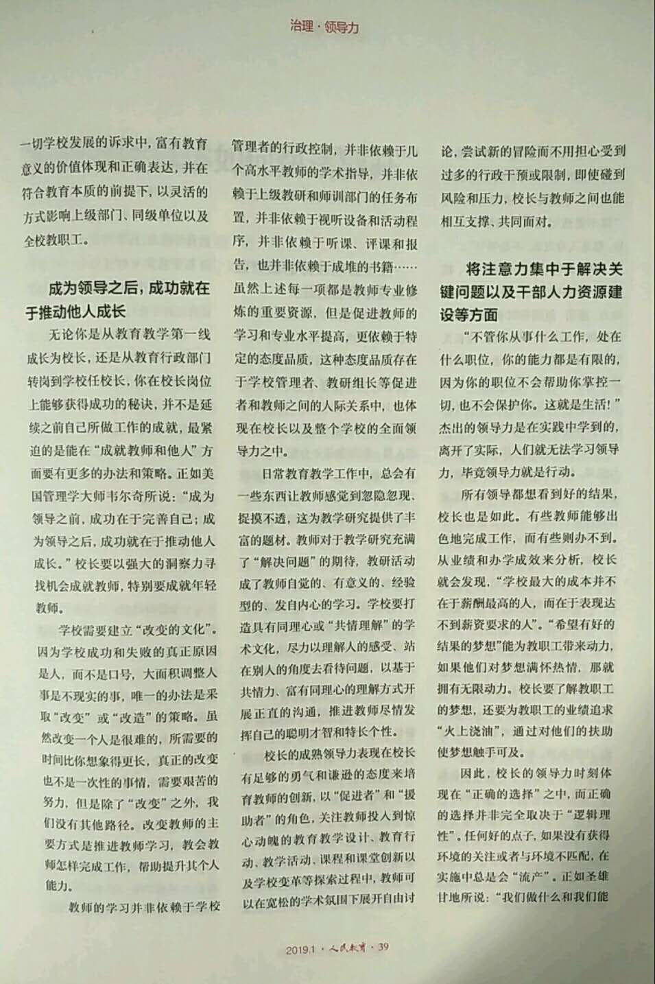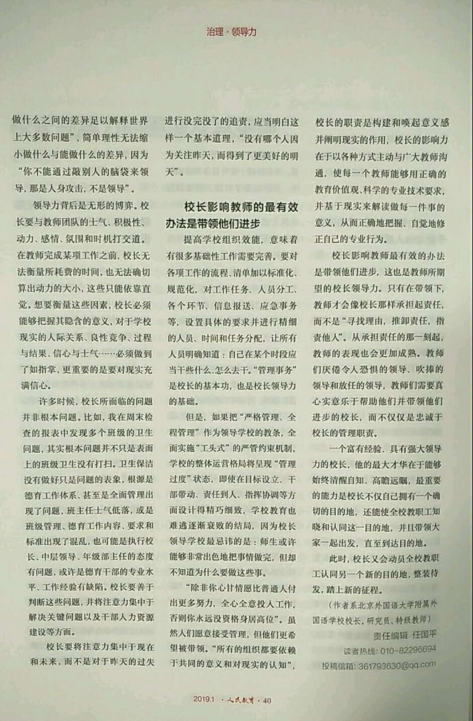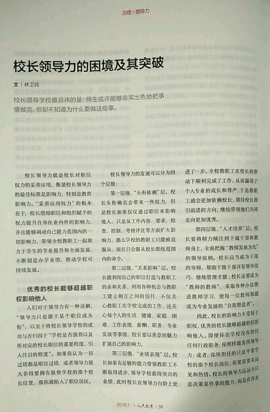 近日,《人民教育》2019年第1期刊登我校林卫民校长署名文章《校长领导力的困境及其突破》,全文如下: