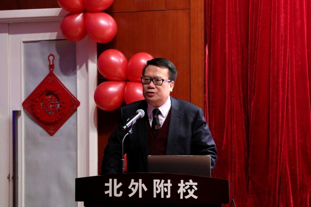 校长林卫民代表校领导,向辛苦工作一年的全体教职员工发表新年致辞,他总结了过去一年我校各校区、各部门在工作中共同取得的成就。2019年是我校建校60周年,林卫民提醒全体教职员工,机遇总是与挑战并存的,他祝福大家新的一年将健康、幸福、干劲、欢乐配齐,与北外附校一起书写新的篇章。