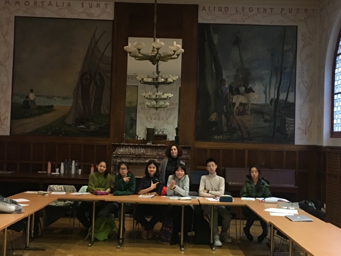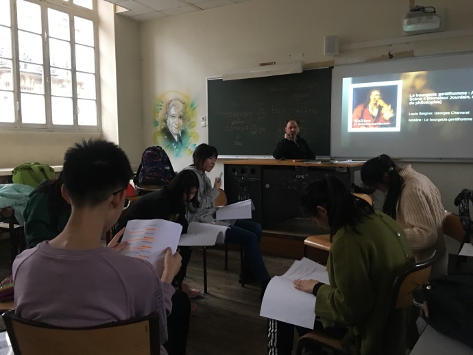 下午我们六个中国学生一起上戏剧课,从下午一点上到五点,老师是以前在大学教话剧的老师,他从拉丁语的话剧一词讲起,延伸到亚里士多德的戏剧研究。老师给我们准备了莫里哀话剧Le bourgeois gentilhomme《贵人迷》第二幕第四场的剧本,老师给大家分配了角色,讲了故事的背景和梗概,尝试着给我们排练这一幕法国经典喜剧。随着喜剧剧情进入高潮,我们也努力让我们读台词的语气融入戏剧中,排练的气氛也逐渐活跃起来,就这样,我们在欢声笑语中度过了整个下午。