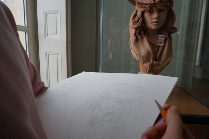 今天,早八点钟,我们集合来到了罗丹博物院欣赏罗丹的草图和雕塑,先运用昨天所学的单词在法方老师的引导下尝试用法语表达绘画及雕塑的各个步骤,我们昨天复习了observer, faire les croquis, découper, coller, sculpter等等动词。之后法国老师让我们在罗丹博物馆挑选最喜欢的一座雕塑进行草图临摹,老师慢慢启发我们,让大家试着把看到的东西用自然柔美的线条表现出来。随后老师没有特别运用技巧,只是随手在画纸上很快的画了个草图作为范例,草图里很清晰能看到雕像女孩子脸部、帽子和发丝的轮廓,我们一下子茅塞顿开,十分用心的把我们心中最美的雕塑展现在草图纸上,为后面完成自己的雕塑做准备。我们的作品各式各样,别具风格,老师并没对我们的作品和原作进行比对,因为艺术是一种表达自身情感的形式,每个人应有自己独特的表达形式。我们每个人都受到了美术老师的认可。这一刻我才意识到,画画其实需要的不光是技巧,也可以像写文章、记日记一样成为一种记录表达生活的方式,不需要写出非常华丽的辞藻,只要能把自己所见用绘画记录下来就会是非常有趣的一件事情。