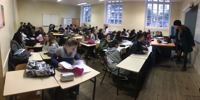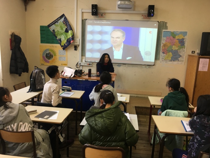 下午,我们和法国同学一起上了历史地理、英语、法语、美术、中文数学课,每节课上我们都做了自我介绍。为了让我们在适应期间方便辨认板书,法国的老师特意在板书常用的花体字旁补写了印刷体,特别细心。