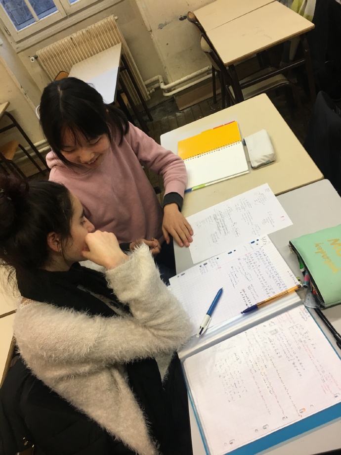 下午我们回学校上两节连堂的法国数学和合唱课。数学课上我们正好赶上了随堂小测,他们学的是等式和解方程,里面很多专有名词,郭老师后来说看了卷子还有些担心我们会看不懂题,其实我们在小伙伴的解释下看懂了题目,并且早早都顺利的完成了试卷。课间的时候我们有的在给法国孩子讲题,有的和法国孩子聚在一起讨论数学都学什么,我感觉我们已经成为了班级的一员。
