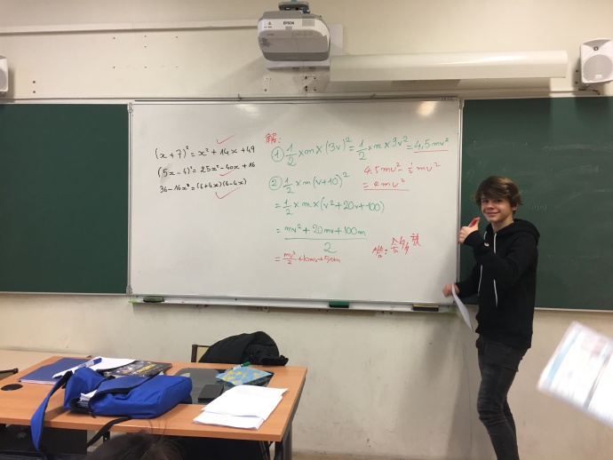 今天的数学课继续学习方程式和几个解方程的公式,昨天的课堂小测成绩发下来啦,我们中国学生大部分都是满分20分,法国孩子的最高分是18.5分,法国数学老师又夸奖了我们,我们也很开心,慢慢喜欢上了法国的数学课。
