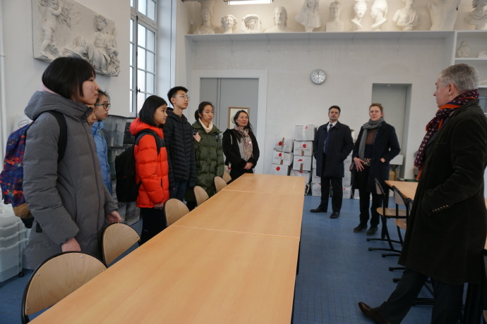 从今天开始我们6名附校法语学生将要按照法国学校作息正常上课了,第一节课上,德萨伊中学初中校长Anne先生和我们一同来到了美术教室并对我们进行谆谆嘱托。另外,在他的介绍下我们才知道我们所在的美术教室位于德萨伊中学最高处,是全校最亮的一间教室,是一间非常古老的美术教室,但在战后一直废弃使用。经过将近半年的整修终于重新启用,而我们则是第一个使用这个教室的学生,真的感到非常荣幸!