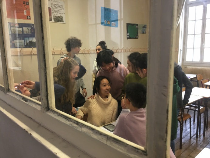 今天上午是美术课和化学课,美术课复习了上次罗丹博物馆的内容,化学课学习了分子和离子的内容。下午的音乐老师请假了,所以这节课上自习,我们和法国小姐姐小哥哥一起玩儿了狼人杀,中国人法国人围成一圈,并没有因语言障碍而尴尬,而是在欢声笑语中度过我们在一起的宝贵时光。