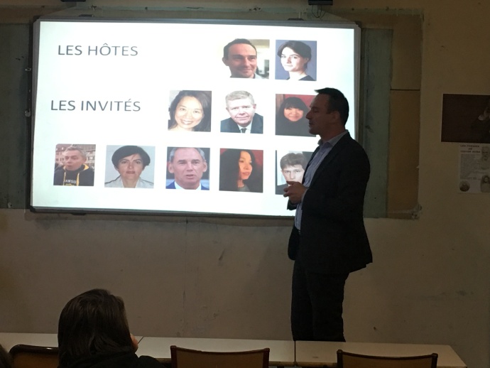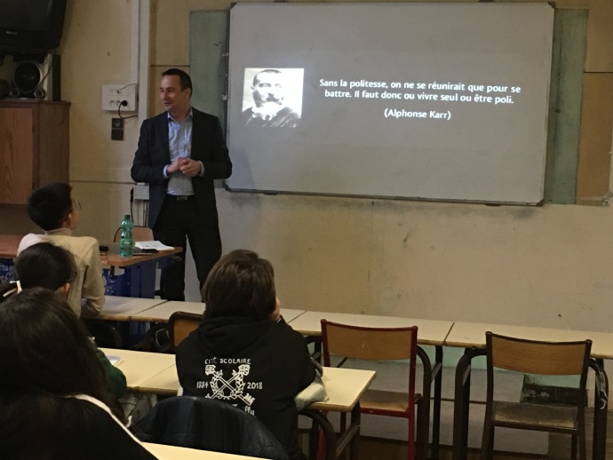 下午17点左右的最后一节课,是官以康的小伙伴佳比的爸爸为我们准备的专题讲座,讲的是法国的礼仪。佳比爸爸认真的做了ppt,以邀请别人来家里吃晚餐为例子,从发邀请函的种类、如何制定菜谱、为什么要用心布置桌子等等介绍整个家庭宴请流程和禁忌。其中佳比爸爸还就如何给客人安排座位设计了一个小游戏,游戏里假装邀请了德萨伊中学的大校长、初中校长、几位负责老师、几位家长和我们郭老师,让大家根据法国家庭聚会给客人安排座位的几大原则给每个人找到合适的座位。比如男女主人分别要坐在圆桌面对面的位置,重要的客人要安排在男女主人左右,在场所有男士和女士要交叉相邻就坐,如果有年轻夫妇不可以拆开,还要兼顾左右邻居是否能有共同话题聊天等等原则,就像做题一样很有意思。后面佳比爸爸还讲了吃饭时面对一桌子的餐具该如何使用,吃饭的顺序是什么,特别实用。他还找到了法国前总理希拉克当年宴请邓小平副总理的菜谱,给大家看了正式宴请会有哪些菜,平常家庭邀请有哪些菜等等。最后佳比爸爸对法国如何打招呼也给大家做了知识补充,比如如何正确进行握手,他还邀请刘明鑫和法国小朋友一起上台做了示范并现场做了纠正,告诉我们比如不能太用力、一定要目视对方等等的小禁忌,后面他还讲了吻手礼和贴面礼等等。