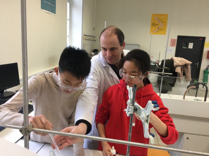 今天的化学课做了酸碱性的实验,老师先讲了实验规则,特别强调一定要站着做实验,并且全程带护目镜和尽量把袖子卷起来,如果试剂滴到衣服的话就会通知家长来送衣服并且记录在学生家校手册上。因为涉及到实验分数,法国化学老师给我们中国学生单独分了小组。实验内容第一项是取少量氯化钠溶液放在试管里,滴入硝酸银溶液,观察并记录产生的白色沉淀。第二项实验是每个人先领了一组小瓶试剂(Cl,Cu2+, Fe2+, Fe3+, Zn2+, Al3+),再把小瓶子里的各种试剂倒到试管里,之后逐个滴入几滴氢氧化钠溶液,记录实验效果。第三项是用PH值试纸分别测试水、柠檬汁、氢氧化钠的酸碱值,我们都顺利做下来了。化学课的课程很有趣,老师也很平易近人。