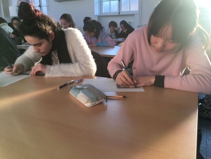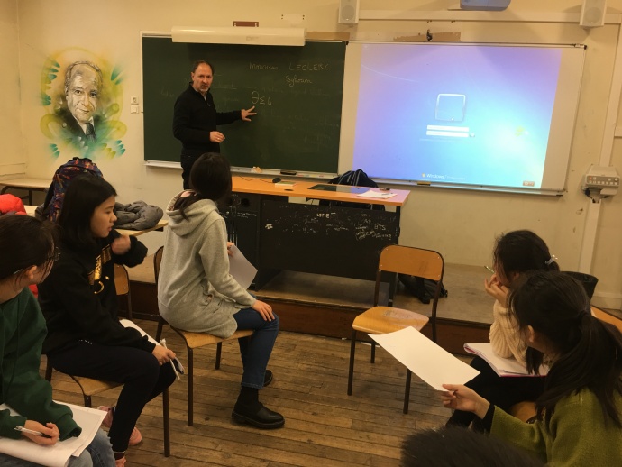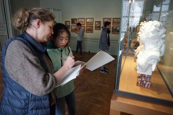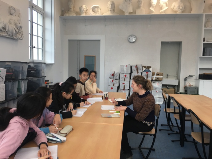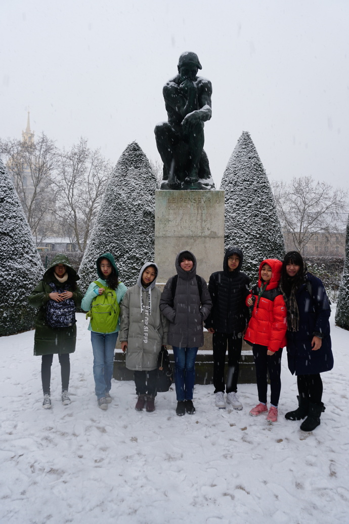 今天课程有美术实践课、法语、历史地理、中文课、中文数学课、美术课。其中美术实践课是法方为我校学生量身定做的特色课程,美术老师先为我们做相关知识、术语的补充,之后会在明天的美术特色课程上带我们去罗丹博物馆完成美术作品。老师们的精心准备,使我们心中的火烧得更旺了,让我们不得不心生感恩之情,感谢这些认真的老师们。