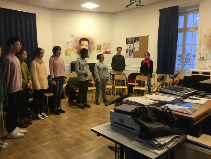接下来我们学唱了三首歌,一首是俄国的歌曲,因为俄罗斯驻法国的大使下个月会来巴黎德萨伊中学访问,所以合唱队准备了个俄语歌曲当节目。另一首是法国歌曲,选自法国作曲家柏辽兹Heetor Berlioz声乐套曲《夏夜Les Nuits d’été》的第一篇,还有一篇是由法国诗人Théophile Gautier戈蒂埃作词的《villanelle田园诗》,这首歌的曲调可能有些奇怪,郭老师看到我们都不太敢开口,她就在网上找到了歌曲和歌词译文发给我们,让我们先多听听,争取下节课能参与进来,我回去会好好看看。第三首歌曲是英文歌,是007的插曲,音乐老师也希望大家都能参与其中,特意引导我们单独唱了几句简单的句子,希望后面我们中国的学生能不怕露怯,多多参与。