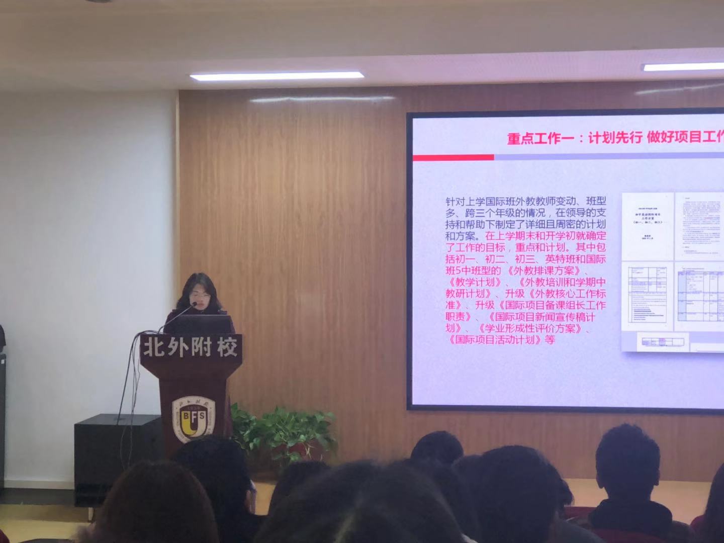 其次,张丽君就初中英语项目组本学期的工作进行解读。她从工作计划、外教教研、中外教沟通、学生成绩、外教管理、学法指导和中西方文化活动、戏剧展演等方面进行了详细解读。