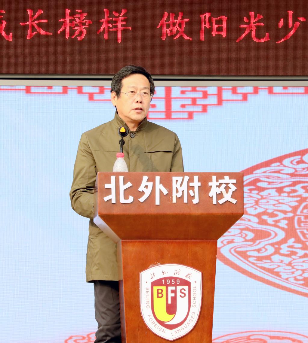 海淀区教工委副书记、教育督导室主任乔键在致辞中表示,在北京外国语大学的大力支持和帮助下,北外附校取得了可喜的办学业绩,得到了家长和社会的充分肯定。在坚守完成国家和地方规定“共同学业要求”的前提下,北外附校坚持“突出外语办学特色”、“让学生更有选择性”的办学理念,取得了学生学业水平和综合素质同步提高的卓越成效。乔键表示,北外附校小学教育认真贯彻与落实“五个一”的教育目标,使全体小学生能够成长为“独立自主、积极进取、学业优秀、素质全面”的阳光少年。他强调,这是“把教育做正确”的一个大方向。最后,乔键代表区教工委、区教委、区人民政府教育督导室对我校学生提出殷切企盼。乔主任的发言,让全体小学师生倍感振奋和鼓舞,使大家对崭新的北外附校小学教育充满了期待。