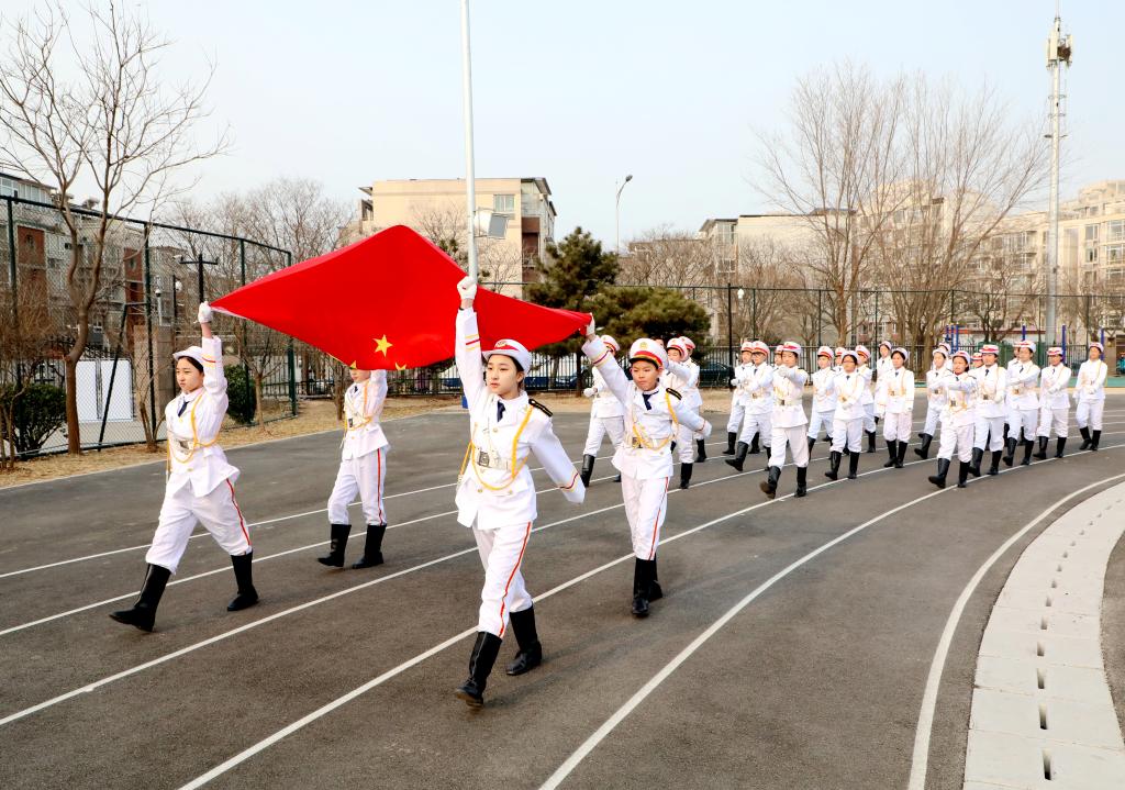 图为我校小学国旗仪仗队的学生们精神抖擞地踢正步