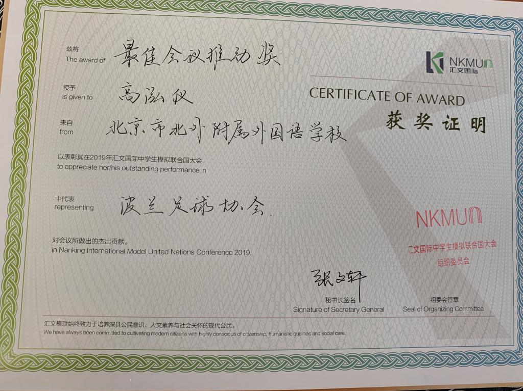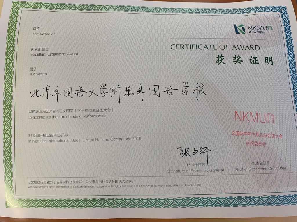 在5天的会期中,同学们与其他代表一起合作讨论,模拟和体验真实的会议流程,既有穿上西装步入会场的豪情,又有唇枪舌战中的淋漓尽致,收获满满。高二(5)班高泓仪同学在欧足联会场中表现出色,荣获最佳会议推动奖;我校也获得最佳组织奖的称号。正如学生代表所说:“这是一个展现自我、开阔眼界、完成蜕变的平台。学术的差距以及自身的弱点都会暴露在自己的眼前,模联正是通过这样的方式让我们成长,形成解决问题的思辨能力,通过批判性的思维训练让我们认识到独立思考的重要性”。