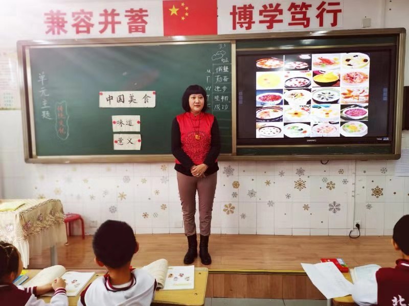 二年级王宇老师的骨干教师引路课《中国美食》巧借中华美食,引出“粥”字的起源和演变,拓展了各种节日、时令与美食的关系并让学生通过工具书查字典去认识与火字旁、四点底相关的汉字,完成自主拓展,从而加强了学生的识字技能,顺理成章。通过叫花子鸡、麻婆豆腐、花边饺子的故事,感悟美食文化背后的丰富内涵与中华性本善的道德之美。通过自由交流家乡美食了解祖国地域之辽阔,激发学生对美食的热爱和美食背后丰富内涵的探究。学生们学得津津有味儿,享受到了语文的快乐。