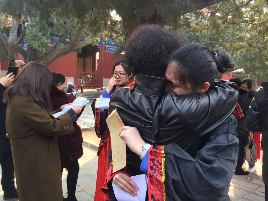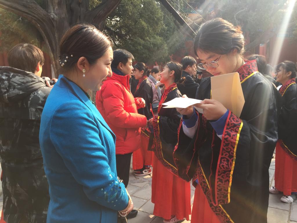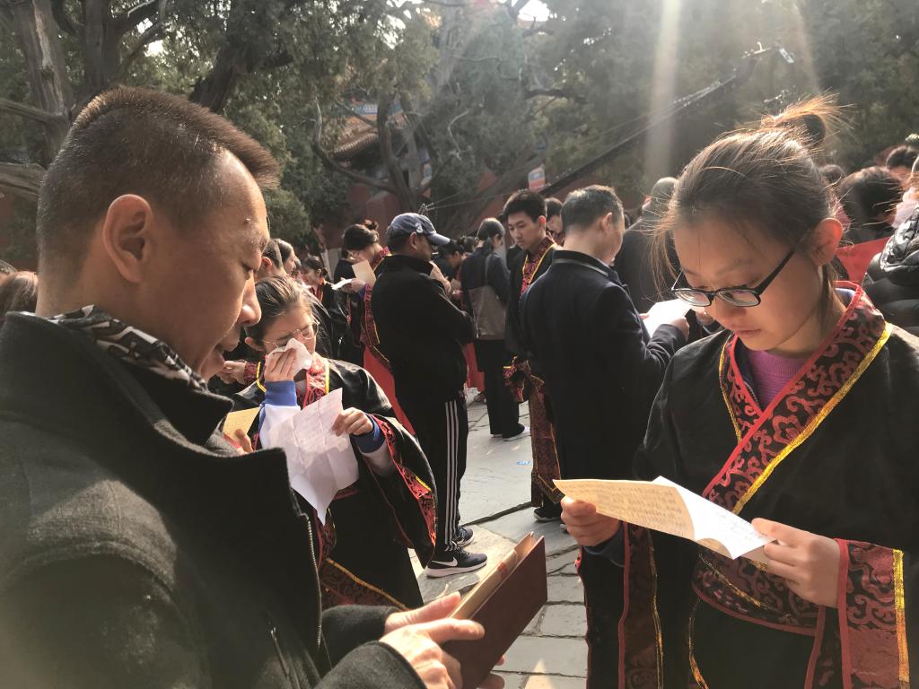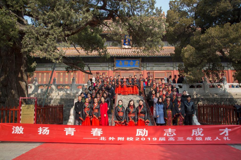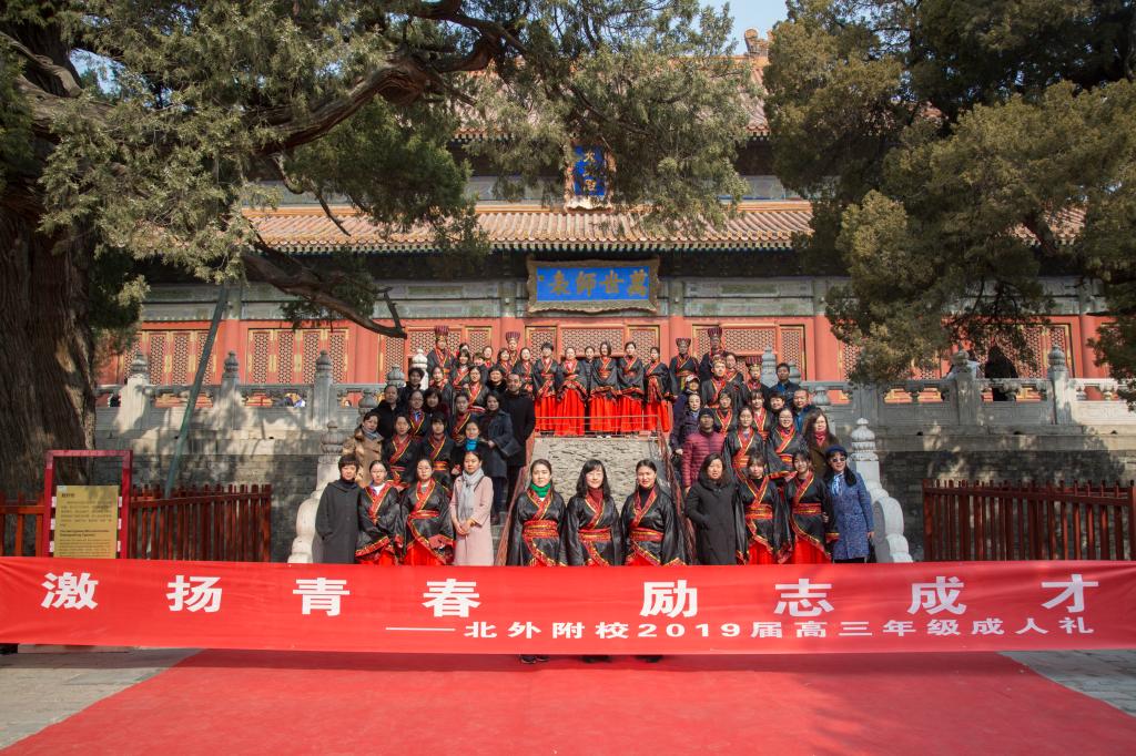 3月1日,北京外国语大学附属外国语学校在孔庙国子监举办以“激扬青春 励志成才”为主题的成人礼暨高考百日誓师大会,北外附校2019届高三全体同学向18岁的责任与担当宣誓,向18岁的挑战与考验宣战。北外附校校长助理、高中执行校长王静,校团委书记、高中德育处副主任郭晓红,宿管中心主任李洪杰,以及我校高三全体老师和学生家长共同见证了这一时刻。