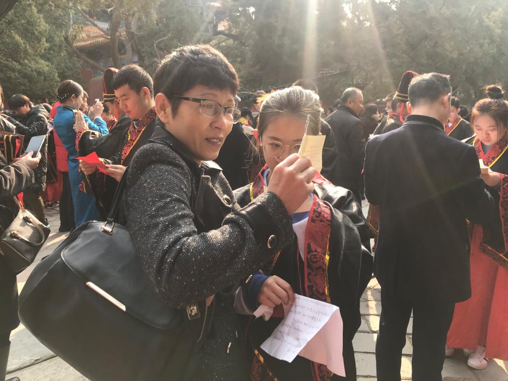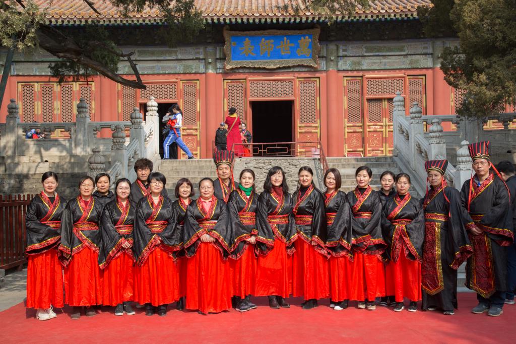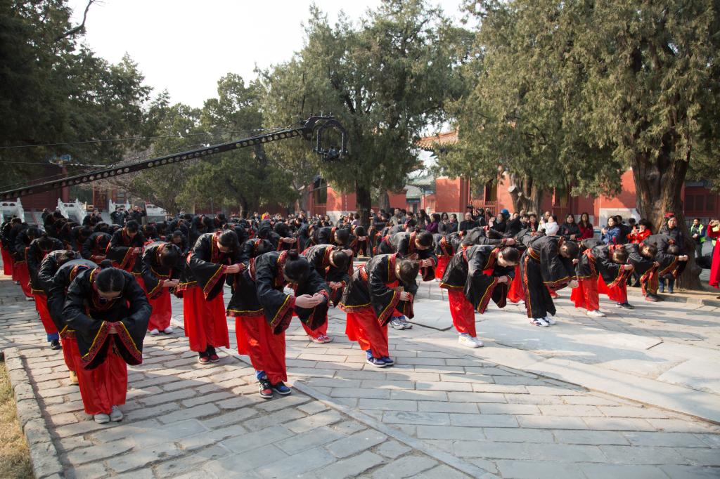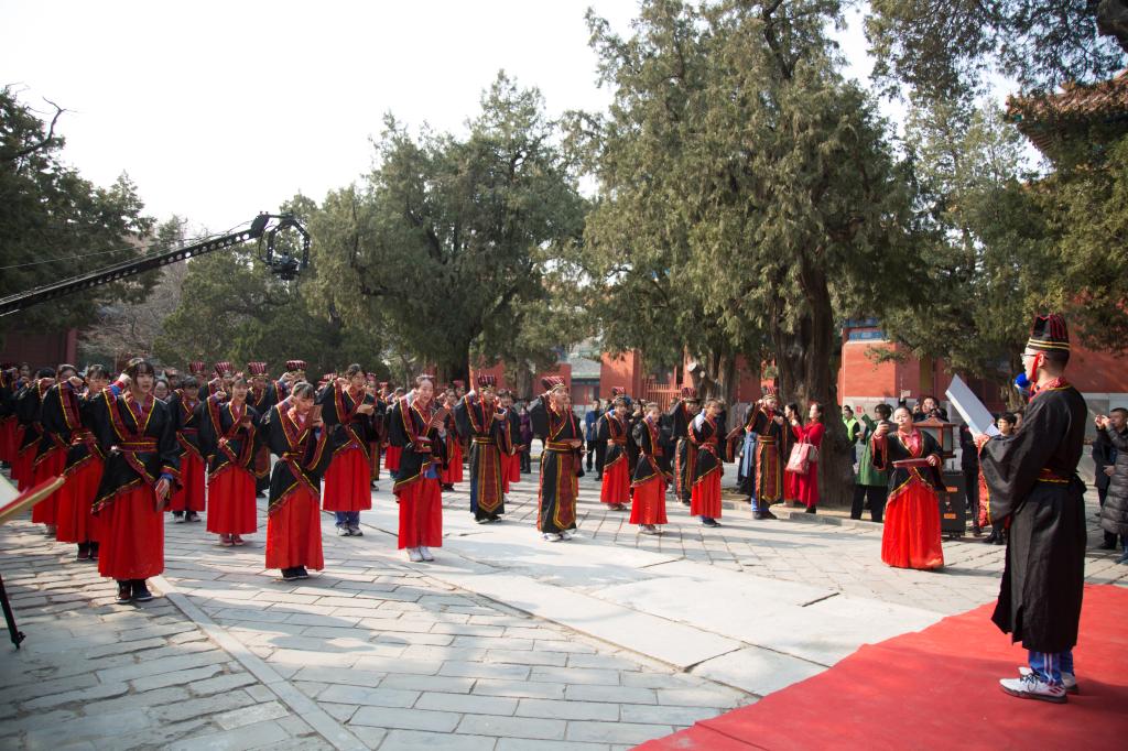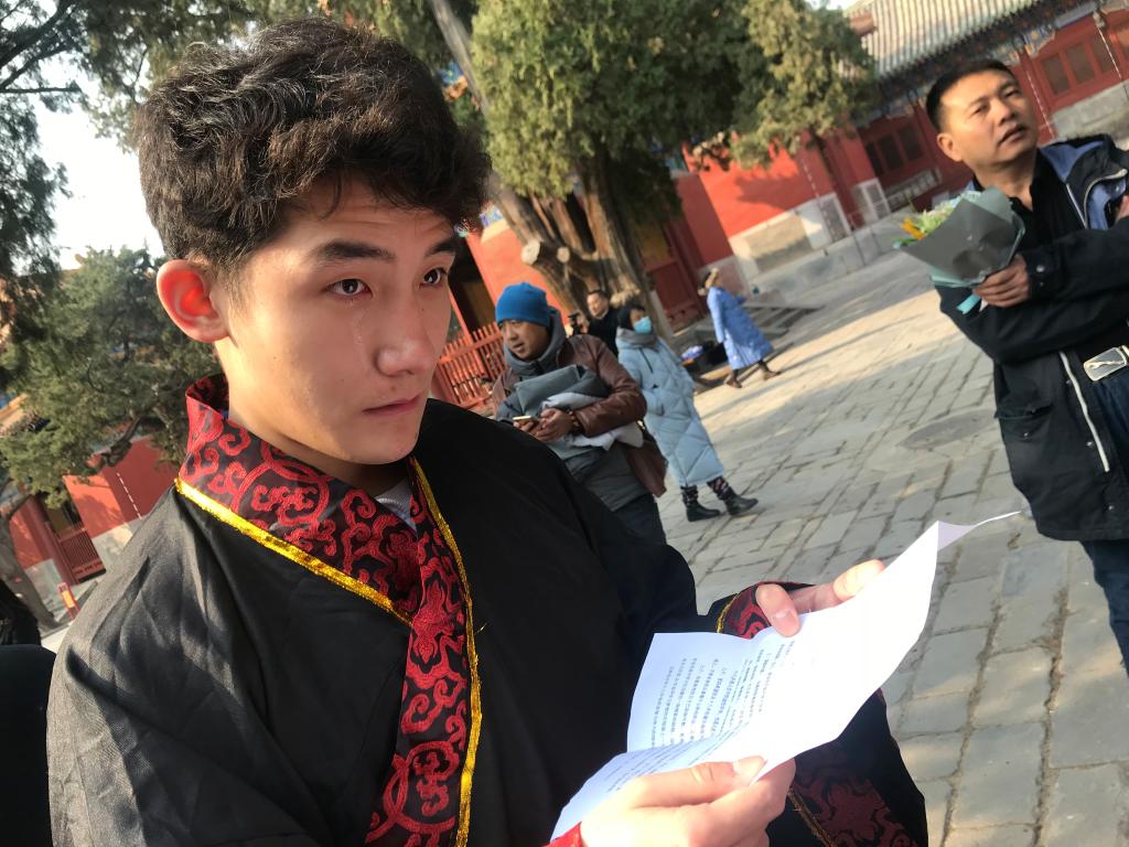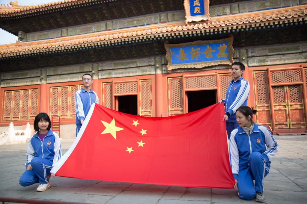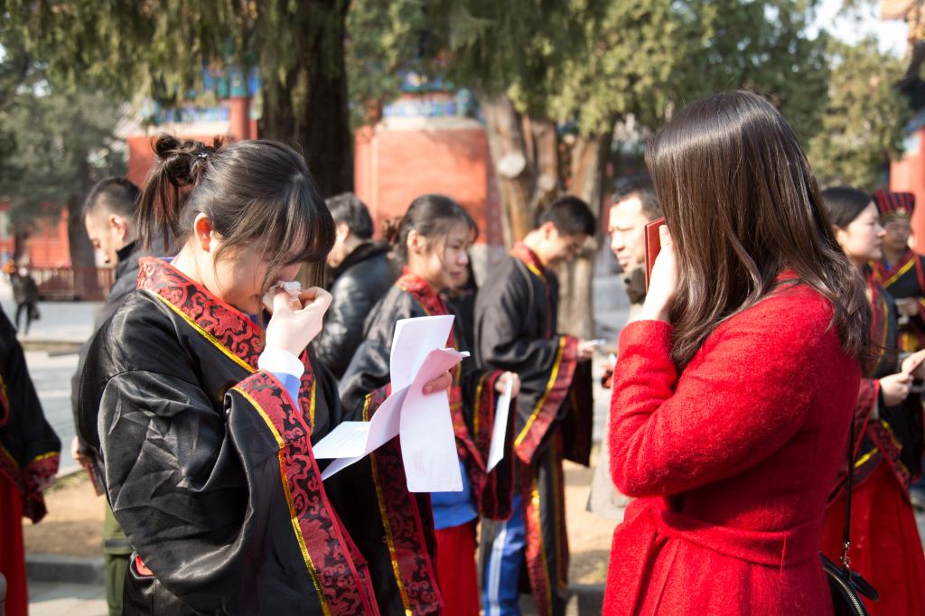 大成殿下,面对国旗,全体行注目礼,齐声唱响国歌。在庄严肃穆的国歌声中,成人仪式正式开始。