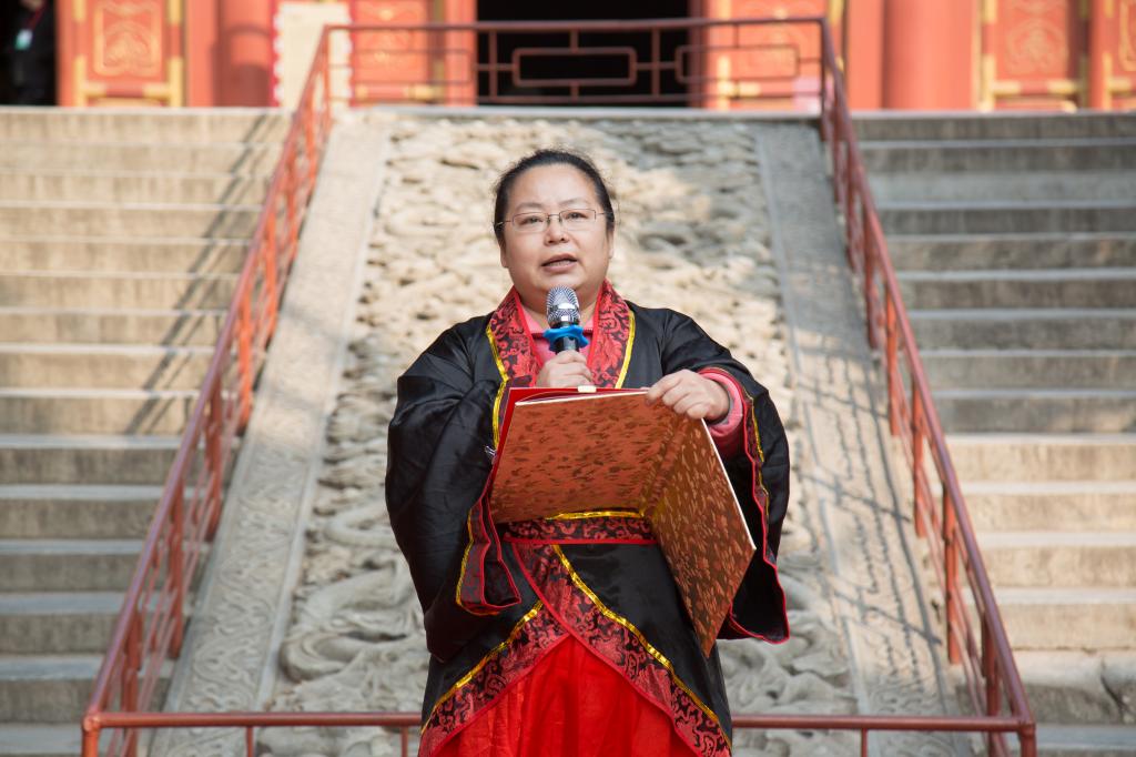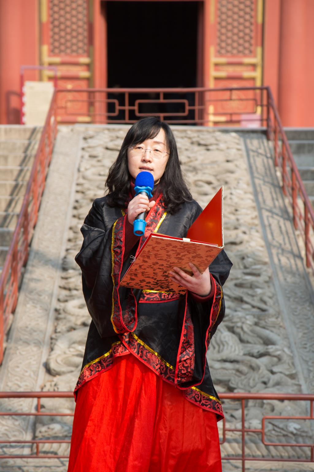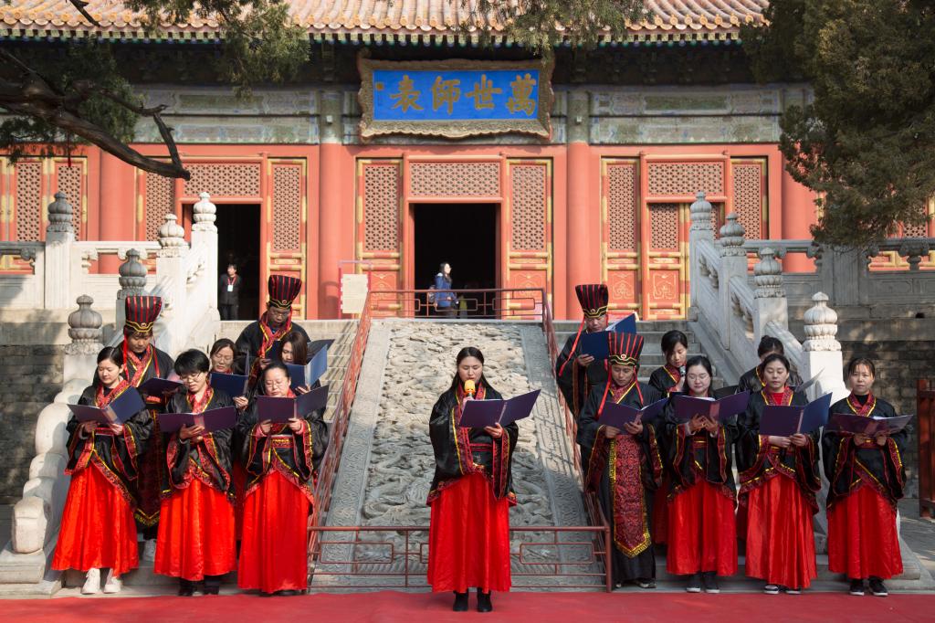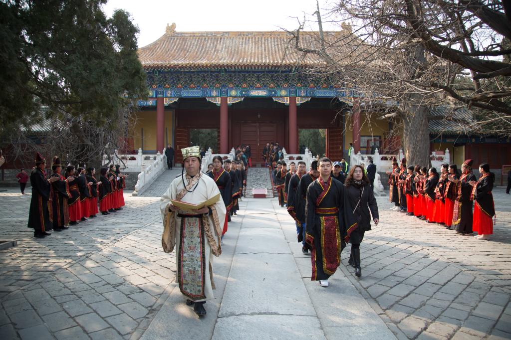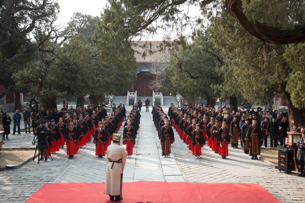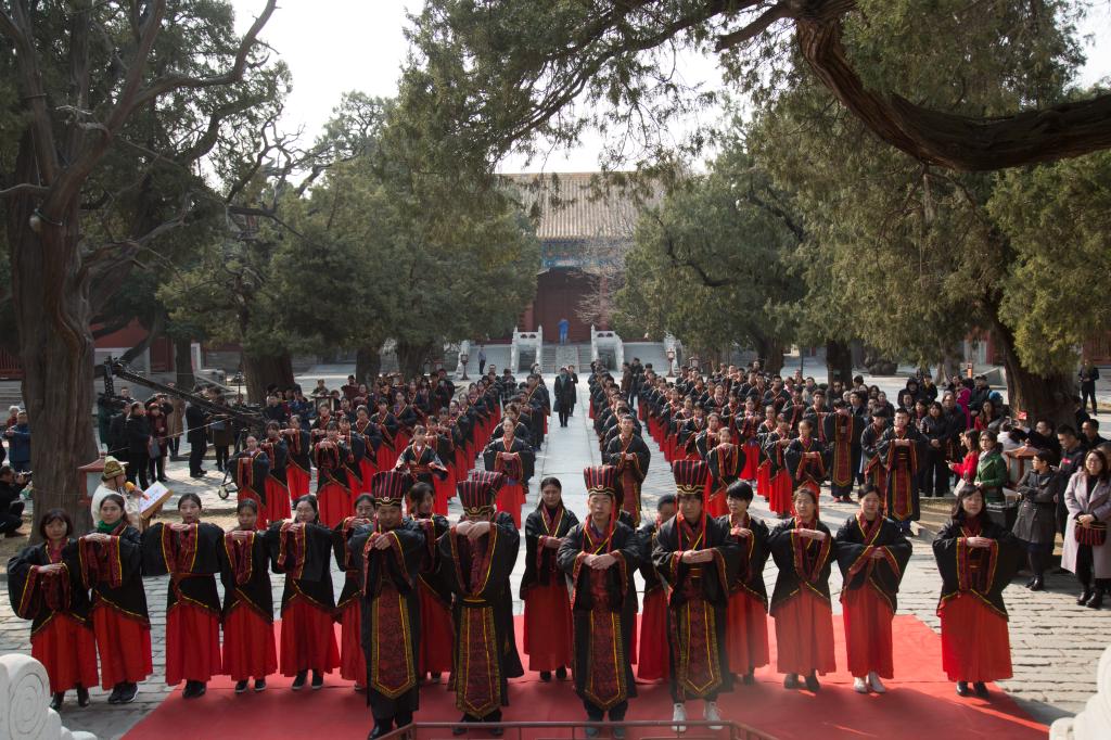 大成殿下,面对国旗,全体行注目礼,齐声唱响国歌。在庄严肃穆的国歌声中,成人仪式正式开始。