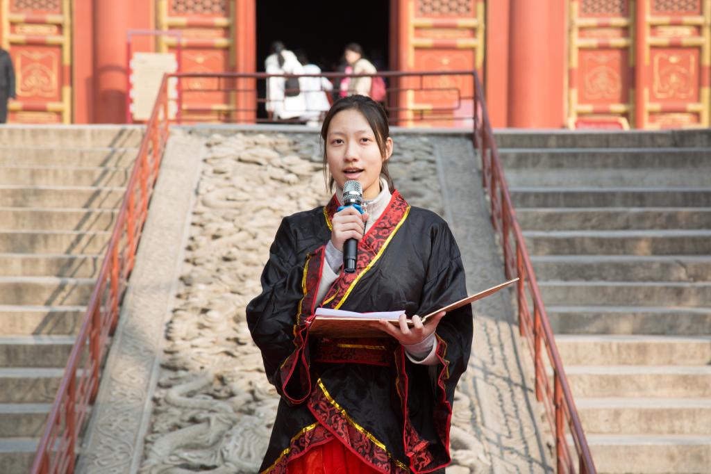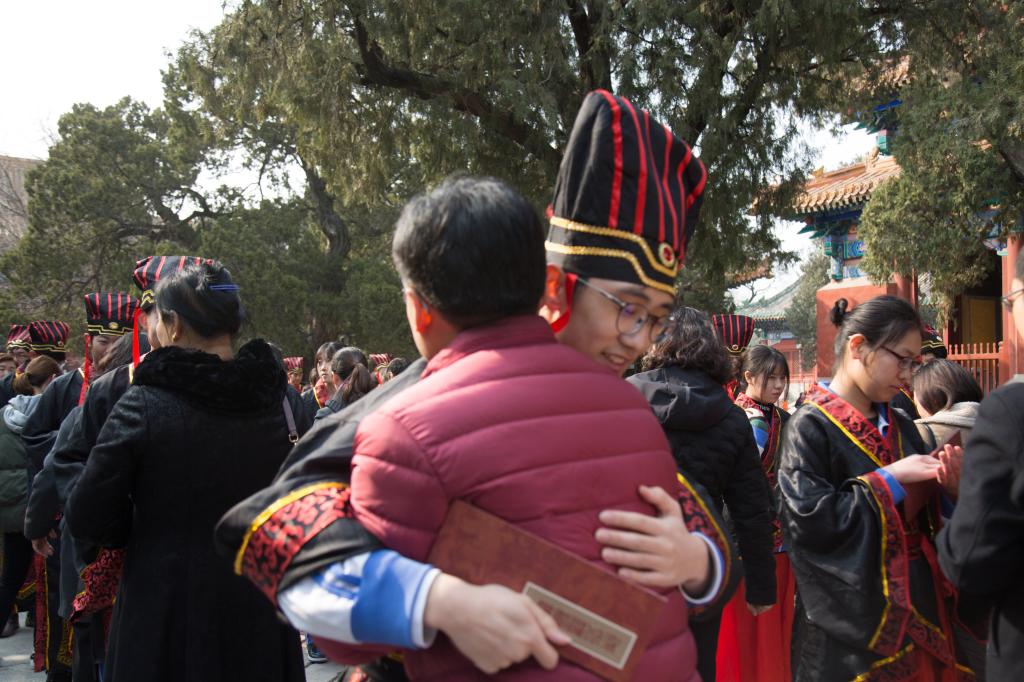右衽衣襟里还怀揣早春三月的料峭,轻舒衣袂却感到和暖凯风带来的消息。长裾翻飞,用五千年的厚重包裹18岁的华年;广袖宽袍,心怀世界的学子此刻体会故土最殷切的期盼。