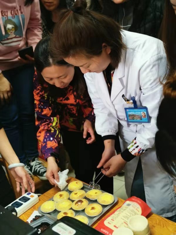 接下来,食堂糕点师傅为本次活动专门准备了制作工具,并进行了现场示范。大家聚精会神地观察师傅的操作过程,生怕错过了细节,还不时拿出手机进行拍摄。在糕点师傅的细心指导下,通过烘烤加工,现场制作的蛋挞、红糖酥饼、曲奇饼干新鲜出炉,香飘四溢,让人垂涎欲滴,丝毫不亚于专卖店的成品货。每一个作品出炉都总能看到大家脸上洋溢着幸福的笑容,吃在嘴里,甜在心中。