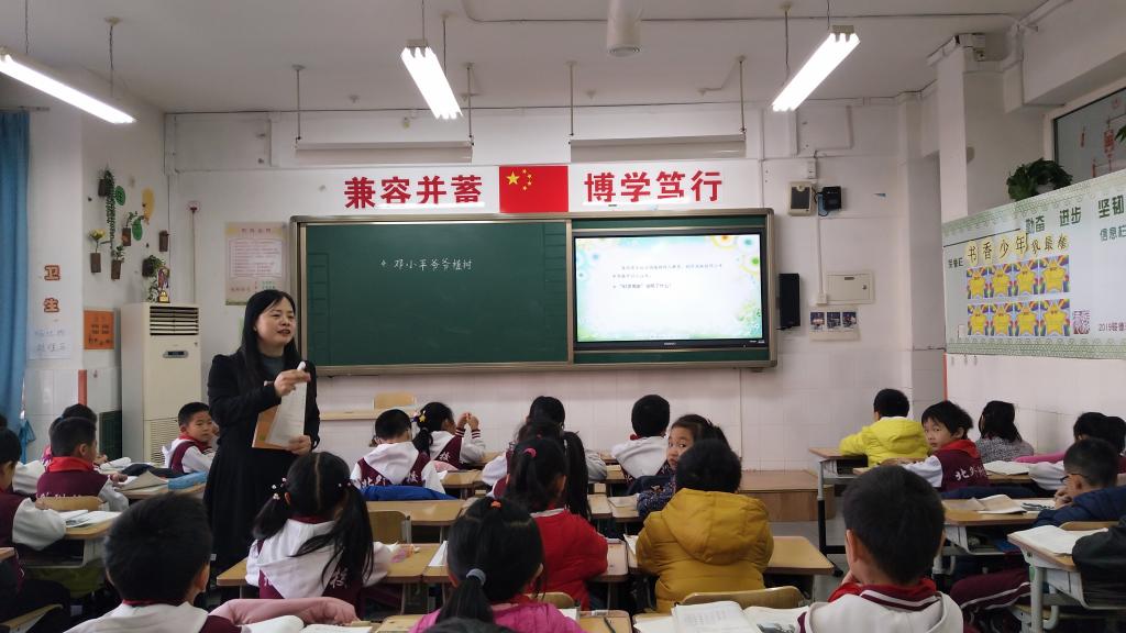 二年级韩银玲老师执教《邓小平爷爷植树》一文。课前,同学们展示了风格迥异、内容丰富的学习方案和思维导图。课堂实践过程中,韩老师通过“核心问题”和“串珠问题”的学法指导,让同学们初步掌握了篇幅较长课文的学习方法,为以后阅读文本深入理解的能力培养打下了良好基础。