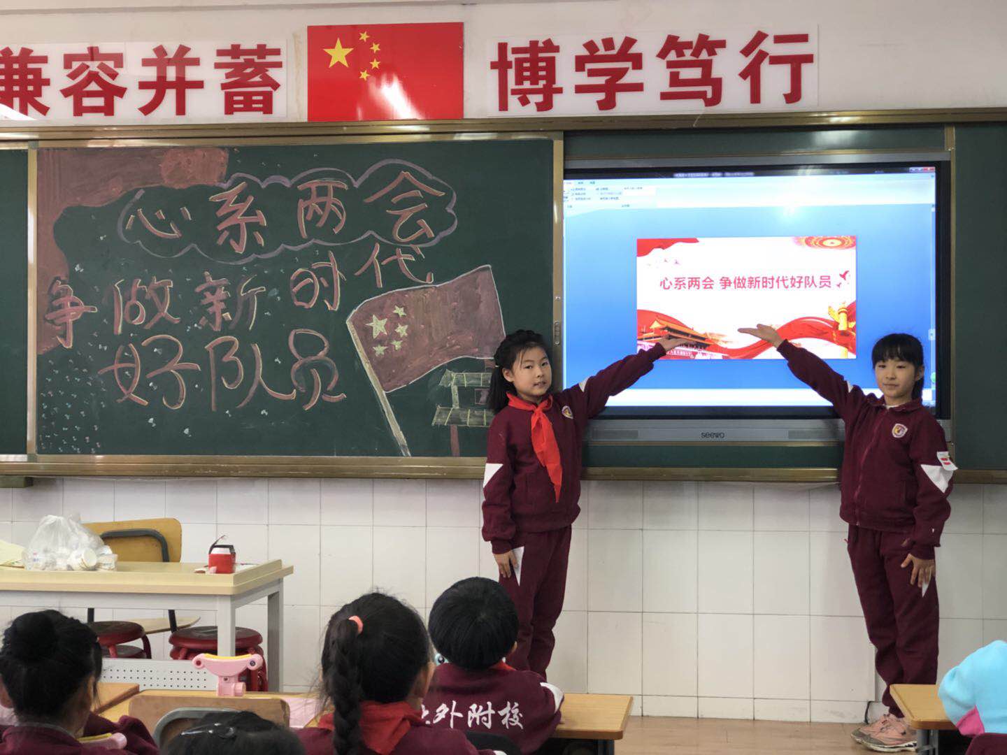 十三届全国人大二次会议和全国政协十三届二次会议分别于3月5日和3月3日在北京人民大会堂开幕。这是我国政治生活的大事,与每个人的生活息息相关。为了让全体队员了解“两会”,关注时事政治,3月11日,我校小学各中队开展了以“心系两会,争做新时代好队员”为主题的少先队活动课。