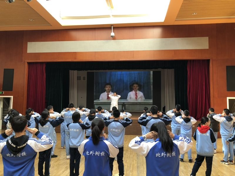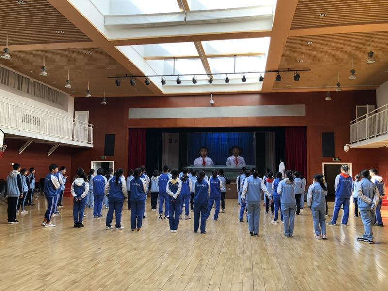 3月14日上午大课间,北外附校医务室校医在国瑞厅对初高中6个年级各班骨干进行眼保健操培训。