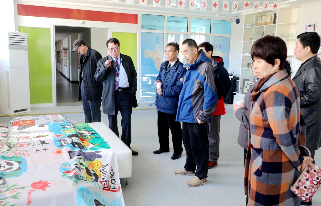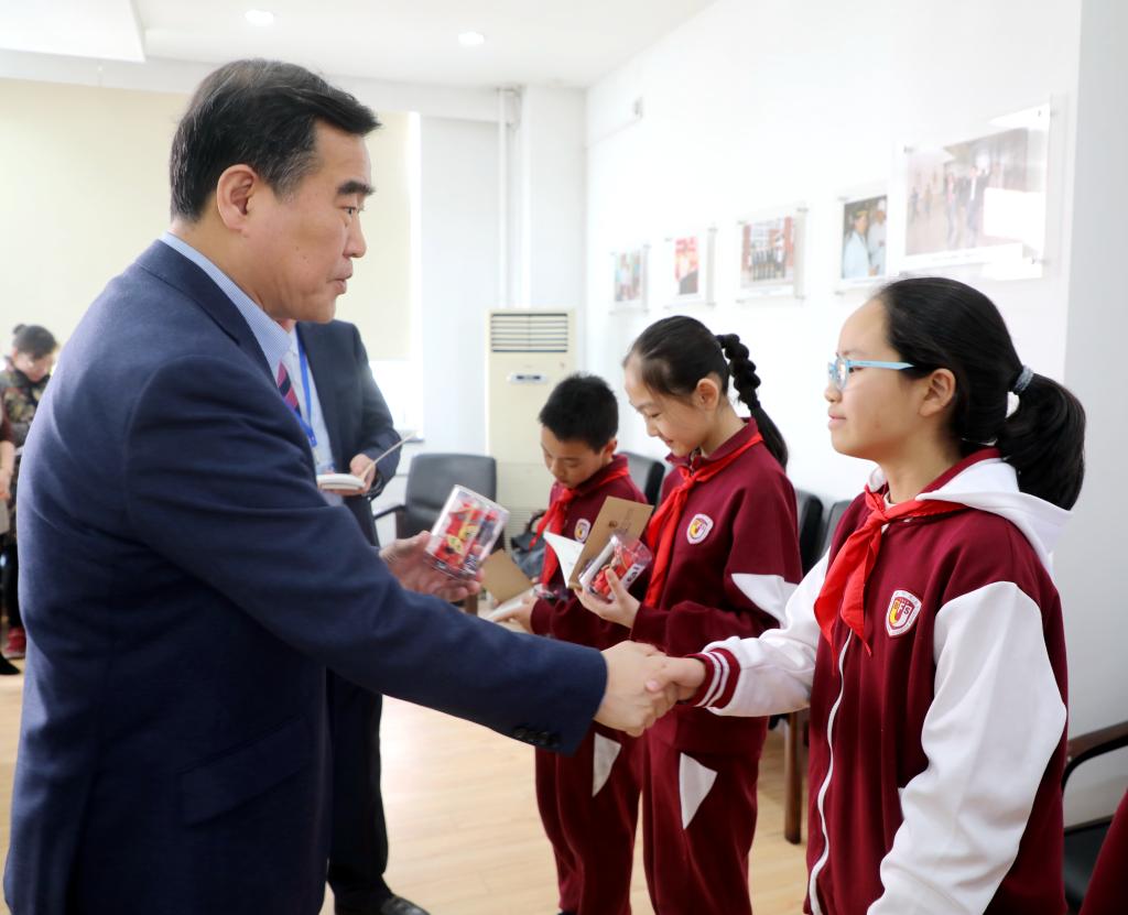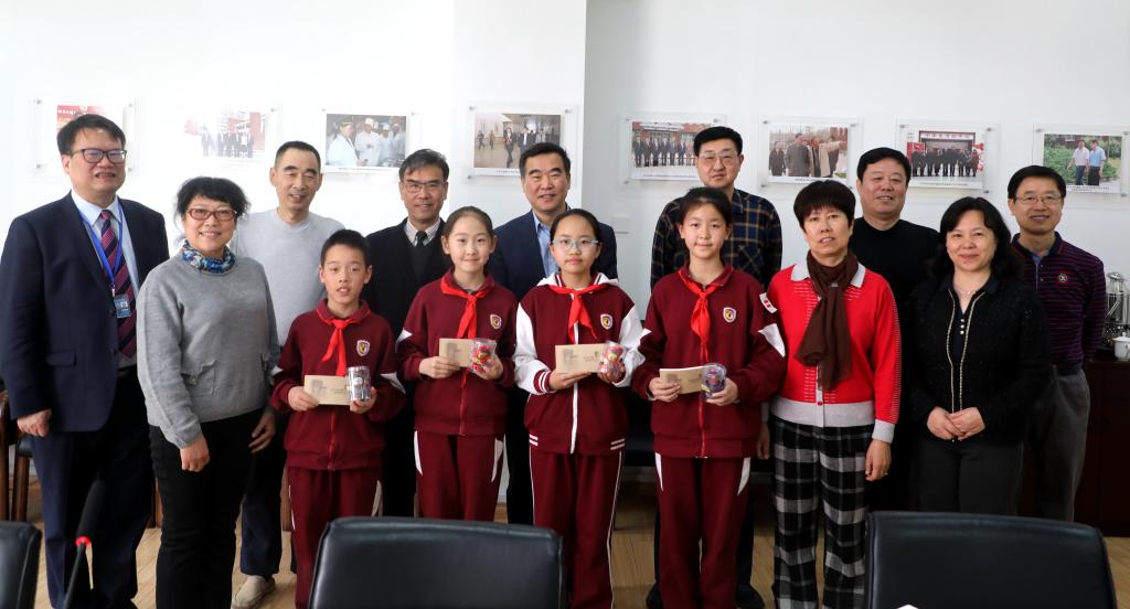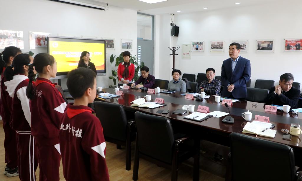 在明媚的春光里,林卫民陪同校友们兴致勃勃地参观了国际展厅、外教课堂、体育馆等处,校友们还会见了我校在单板滑雪、小主持人、英语戏剧、新闻写作等方面取得优异成绩的四位小学生代表。校友们与孩子们亲切交谈并鼓励他们继承北外附校“兼容并蓄,博学笃行”的优良传统,从小立志,打好外语基础,将来成为外语过硬、专业精通的“复语复合型”人才。