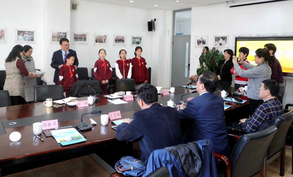 当日,林卫民校长约好与4名优秀小学生代表座谈,适逢我校69级英、法、俄语班的校友团一行8人回访母校。借此机会,林卫民校长安排这4名优秀小学生代表与老校友在209室见面,这一历史性的时刻被永久记录了下来。