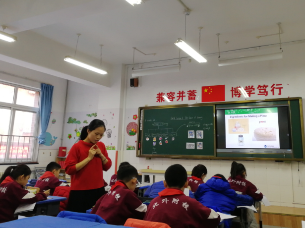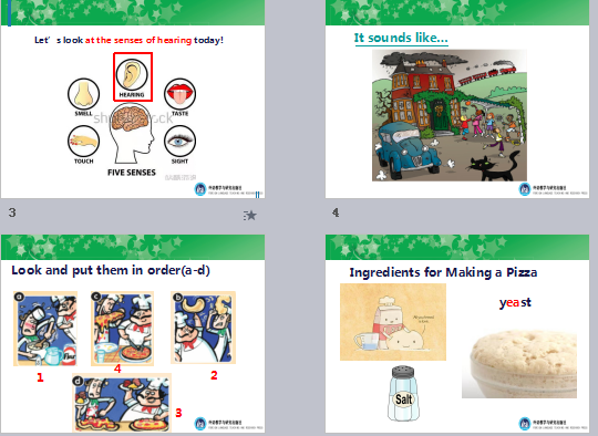 本课时是本单元基于单元整合主题式教学的第3课,朱小玲老师以科学俱乐部(Science Club)为情境,通过复习人体五种主要感觉(The Five Senses),直接切入主题——听觉(The Senses of Hearing)。在呈现阶段的第一部分,教师向学生呈现了课本上的一幅图片,作为复习和操练句型It sounds like a(n)的语言素材,教学活动包括:观察图片,预测会听到的内容;组织学生运用It sounds like...描述听到的声音;引导学生将听到的声音进行归类,如:大自然、动物、交通工具等常见的声音,为后面的活动铺垫。在呈现环节的第二部分和操练环节,教师通过讨论音乐这类声音,引出本课时学唱的歌谣Making a Pizza;通过三遍听、唱,分别完成对歌曲旋律的感知和描述、歌曲中重难点词、词组和句式的理解和歌曲押韵词汇的归纳。教学活动包括:听歌曲同伴讨论歌曲旋律,如:It sounds fast\slow\soft...;听歌曲给图片排序和图文匹配;听歌曲并关注押韵现象,如:cook和look等;在Progress环节。学生完成情境任务,以制作披萨为题材,以厨师的身份,编写一首自己的披萨歌谣;在小结环节,教师引导学生表达这节课学到的内容和学习感受等。