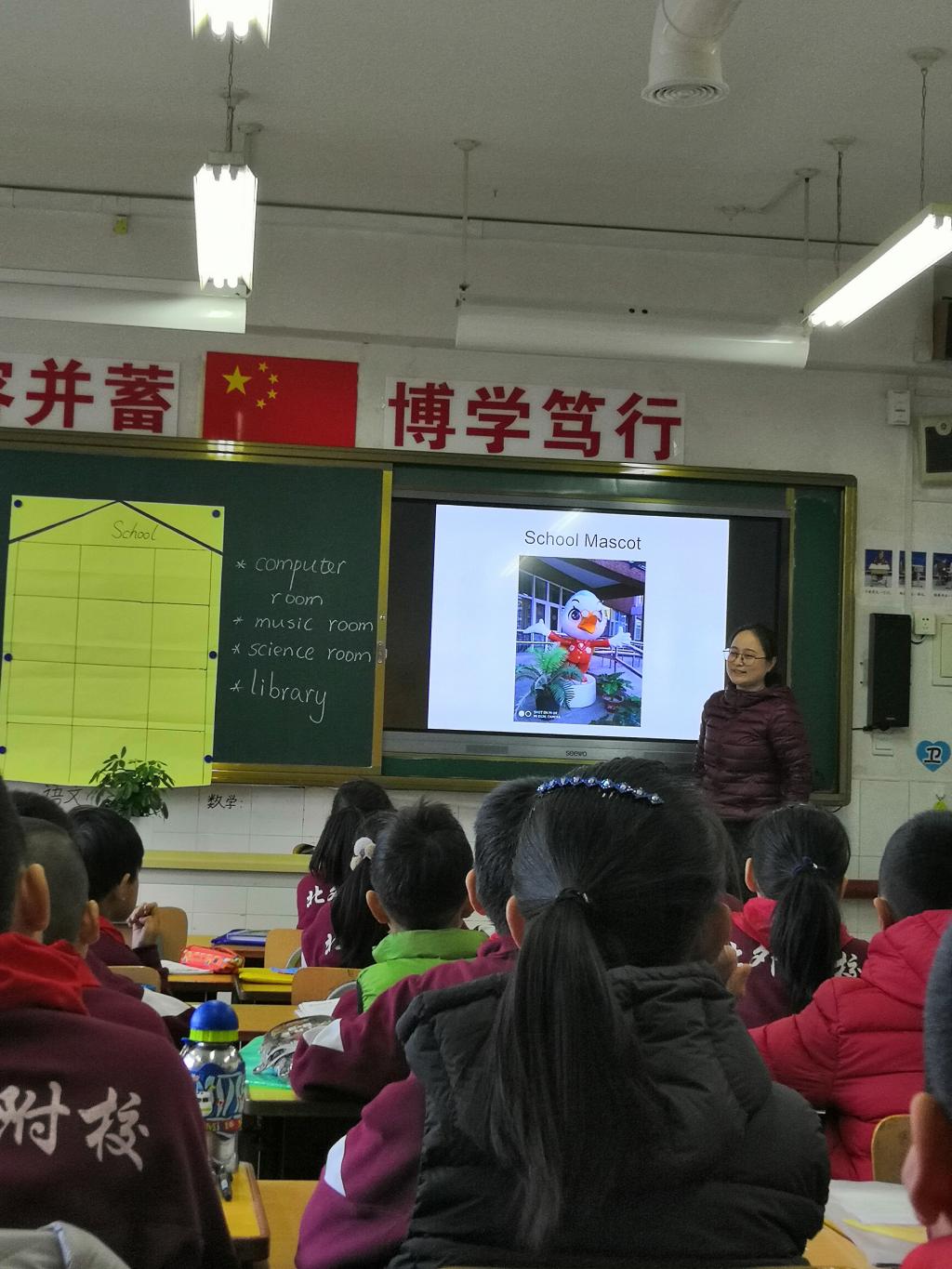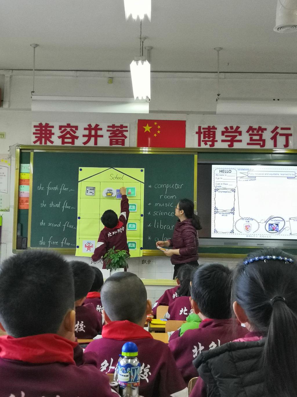 随后, 刘老师通过四张附校的图片将学生们带入到现实生活中来:附校校徽, 附校全景图,附校吉祥物,附校小学楼。孩子们的兴奋点被激发,重点谈了谈小教楼各楼层的教室安排。老师用边贴图标边描述的活动形式激发更多孩子参与表达的热情。