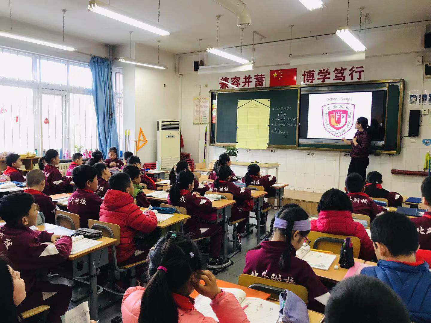 刘老师通过动画视频My School导入本课的学习主题,孩子们跟着视频内容大声朗读,激活头脑中已有关于学校校园的词汇储备。接着,老师利用功能教室的标识图片引导孩子们说一说自己的学校情况,让孩子们再次复习了本单元的核心词汇:美术教室 art room,音乐教室 music room, 图书馆library, 科学教室 science room,教室办公室 teachers’ office。另外增加复习了我校小教楼其他几处功能教室的词汇:围棋教室chess room,机器人实验室 robot lab,阅读角Reading Corner,医务室nurses’ room,活动厅hall。与此同时,老师的提问更加的深入,学生们不仅复习了教室的名称,还自由谈论了在功能教室的各类学习活动,学生们的表达欲望进一步增强。随后,老师用PPT给学生们展示了一篇英文绘本,学生们跟读并进行讨论,说一说中外小学校园环境的不同之处, 增进学生们对中西方文化理解教育。