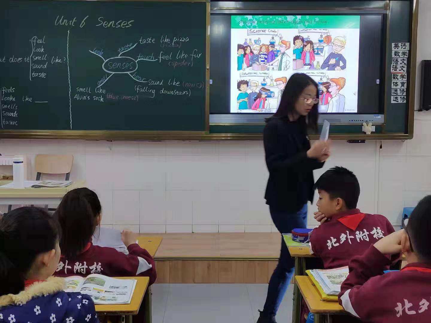 首先,老师基于课本内容,创设了“Cherry’s Science Club”的情境,学生对此十分感兴趣,同时也充满了好奇心,之后老师分别让学生通过触摸、听、闻、看、尝体验人体五种不同的感觉,在学生亲身体验的过程中,教师将本课的重点句型穿插其中,学生通过单独回答、小组讨论、集体回答等多种形式,充分感知句型结构及其含义。其次,老师邀请大家在Science Club进行更多的体验,播放听力,抛出问题,了解整段听力的大意,之后分部分听,操练句型,老师进行更细致的讲解。然后,要求孩子们整体听并做shadow reading,听后解答学生仍不理解的地方。最后,孩子们分角色表演本段对话。