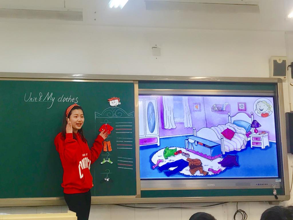 本节课贾薇老师创设Stella 和Simon 去三亚旅行的情境下展开教学。首先,选择出行服装进行句型呈现;其次,帮助学生准备行李,在此过程中进行句型操练;最后,通过作业布置达到情感升华及联系生活实际的输出。课上,贾薇老师首先让同学们观察黑板上多的衣柜,激起学生学习兴趣。以问答的方式,帮助学生复习本单元衣服单词。“What’s in Stella’s wardrobe?What’s in Simon’s wardrobe?What’s it?”在呈现部分,让同学们进入情境中,观察发现出Stella的裙子脏了,Simon穿的夹克太厚了,进而帮助他们准备合适的衣服来深度学习课文文本及句型She’s got ……He’s got.....;操练部分,贾薇老师让学生们以组的形式帮助Stella 和Simon准备行李箱,将合适衣物粘贴在行李箱内,学生不光很好地输出,同时也学会将语言应用于生活中,学会自己整理内务。课堂上,学生们积极参与课堂,师生配合融洽。