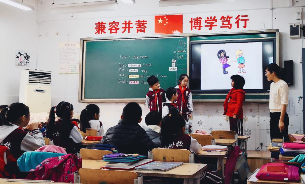本课是围绕单元主题My town展开的一节句型课。在热身环节,任晓蓉老师以一首欢快的英文歌曲On in under导入,对所学介词进行了感知,同时通过询问Where is the pencil?对所学介词进行了复习。导入环节任老师通过学生观察图片人物的位置关系分别学习了介词between,in front of,next to及behind,同时通过同伴合作及小组合作方式操练了Suzy’s in front of Stella等句型。在新知呈现环节,任老师通过让孩子们观察文本图片talk about the picture,对所学句型在情境中进行了操练;同时通过设疑Why Suzy is not happy? 听文本获取信息,学生最终在同伴合作中,对文本内容进行质疑,加深了对句型的理解与应用。