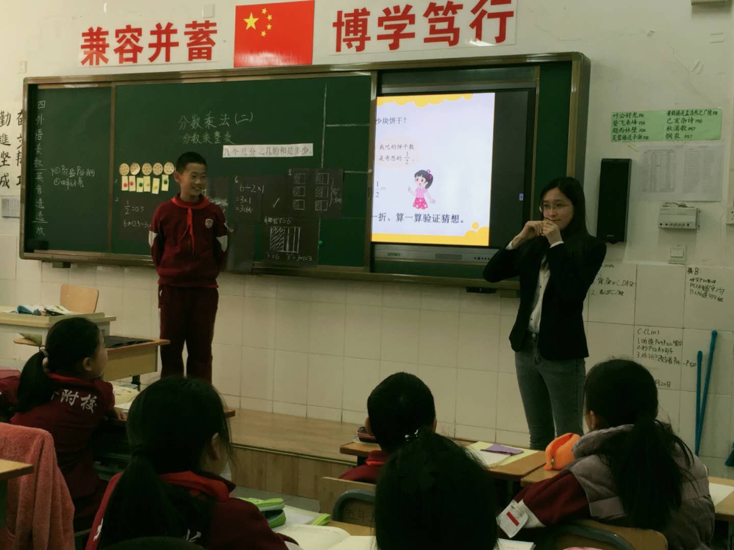 初春老师在五(4)班进行了党员教师研究课《分数乘法(二)》。本节课学生在已有知识的基础上继续拓充分数乘法的意义,在一次次的猜想与验证中发现、得到结论,并将其与生活实际相联系。通过本节课的学习,学生真正体会到数学与生活的密切关系,激发了学习兴趣,同时进一步培养了发现问题、解决问题的能力。