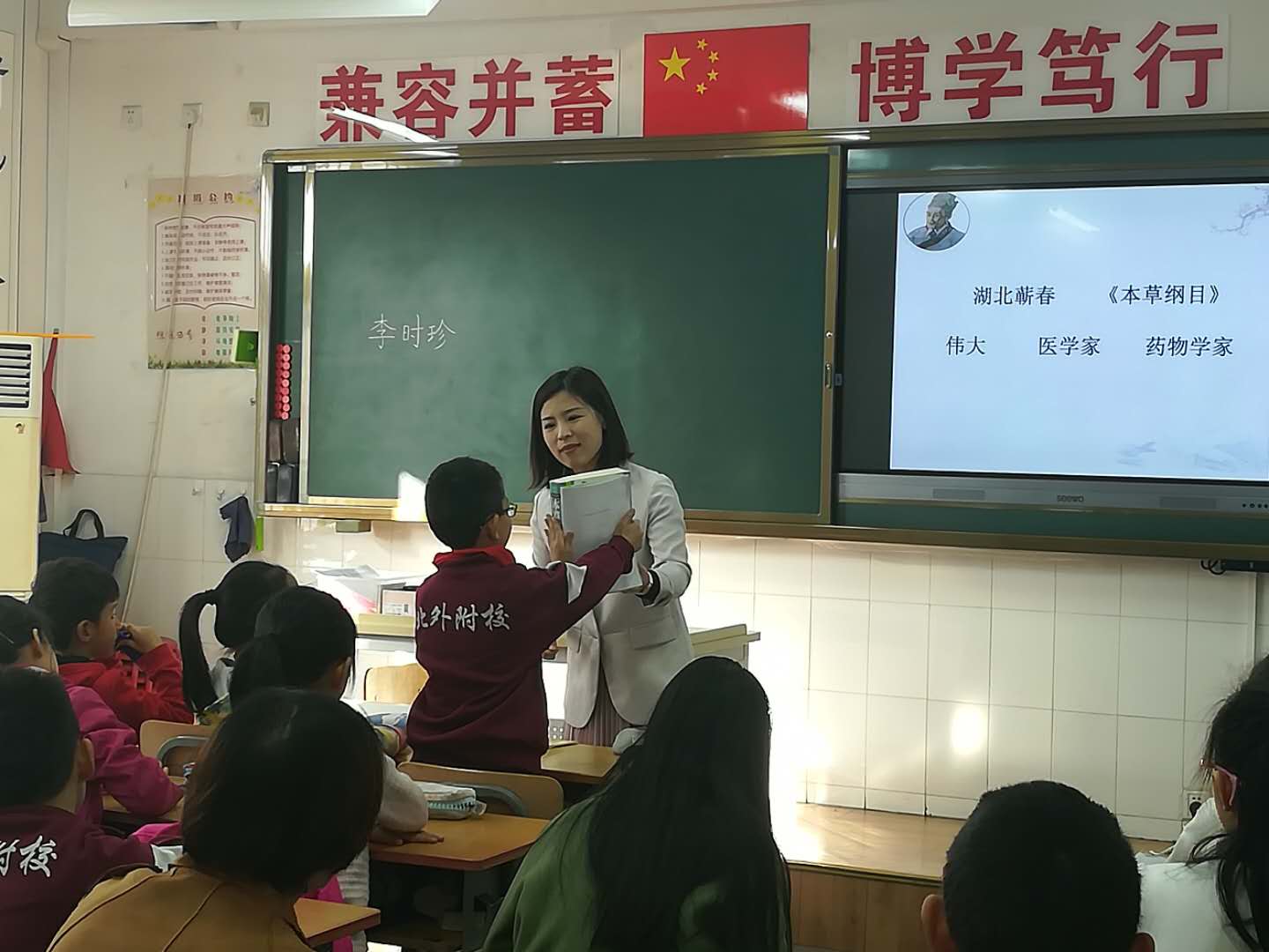 3月27日,于苗苗老师在三年级(1)班执教“观察与发现”主题单元的《李时珍》一课。于老师紧扣人物传记中以典型事例体现人物精神品质这一文本特点,带领学生品读体悟李时珍编写《本草纲目》一书的艰难。通过展示实例,让学生亲自感受这本书的“厚重”。在教学过程中,于老师更是注重学生语文学科能力的培养。扎实落实段落教学策略,引导学生尝试从一句话中提取关键词,并且利用这种方法,学习概括段落的主要内容。教学设计充分体现出教师对学生阅读能力培养的意识。课堂上更是运用默读、自由读、想象读等多种形式的朗读,激发学生诵读的兴趣。教学层次分明,形式多样,注重实效性。
