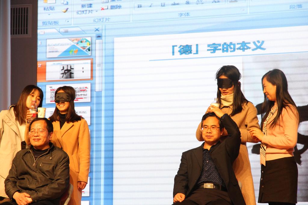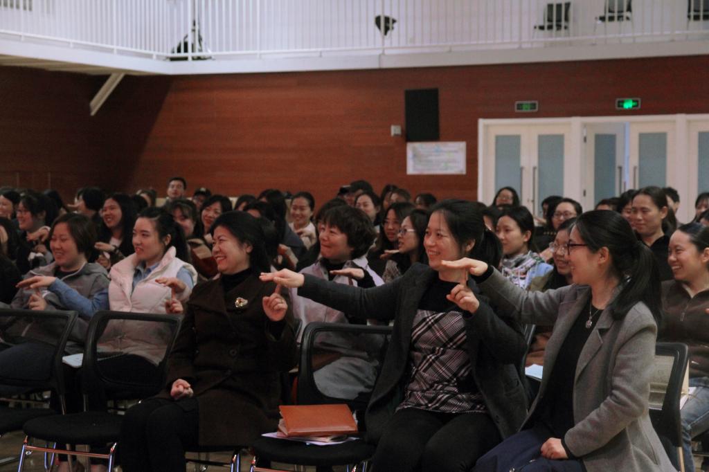 张老师从德、学、习三个字入手,借助游戏、故事,让教师明确与学生有效沟通,改变孩子的不良行为。张老师进行了一些现场的游戏,老师们积极参与、发言,通过游戏让老师们亲身体验其中的道理。