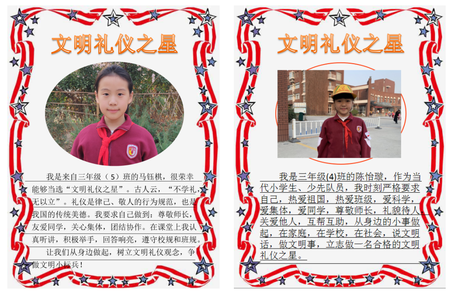 在为期五周的活动中,老师们在少先队活动课上开展“文明礼仪”主题教育,加强注重对学生行为习惯的指导与纠正,组织学生自评互学。各班评选出“班级文明礼仪之星”,推选出一名同学作为“校园文明礼仪之星”的候选人。