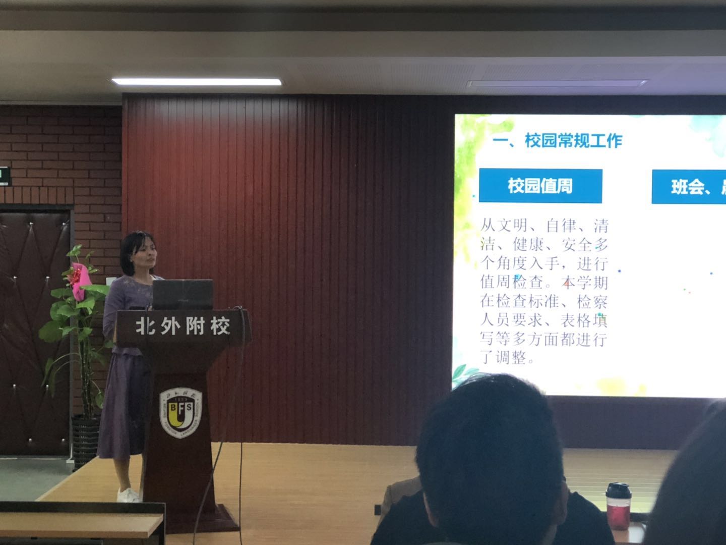 初中德育副主任章继华总结近期德育工作,她从常规管理和德育活动两个方面进行了汇报。杨磊主要从近期的听课反馈和作业检查反馈,以及家长开放日对教师课堂评价的反馈等方面进行了总结。他提出从以上反馈中看出目前教学工作中存在一些问题,并针对问题提出了一系列改进建议和要求。杨磊还就我校新入学的学生情况进行了分析。他指出,我校新入学学生素质优秀,基础扎实,老师们应该从自身思考如何在现有基础上培养学生进一步走向卓越。