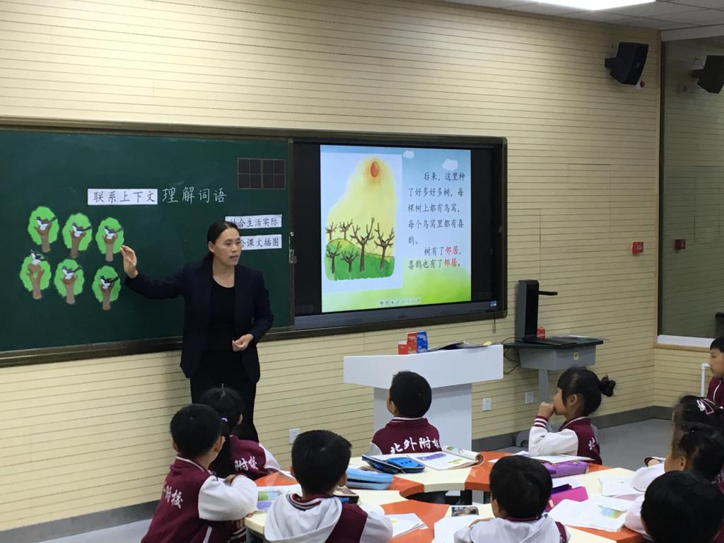 首先由一年级李春兰老师执教一节以“小学语文低学段单元整体教学”为主题的教学研究课《理解词语》。上课伊始,李老师通过创设情境,以复习导入的形式来开始本节课的教学内容。接着,李老师顺势提问“孤单”是什么意思?指导学生利用文本从课文中找出答案,进而教给学生学习联系上下文的方法来理解词语,并迁移运用。一年级学生离不开朗读,在上课过程中,李老师通过个人谈感受读、想象画面读、创设情境读、师生合作读等多种形式朗读加深对词语和课文的理解。低年段的课堂是充满童趣的,学生们生动的表演把本节课推向了高潮。最后,教师利用“三赏”讲字法指导学生书写本节课的生字。整个教学过程中,李老师教态亲切自然,教学内容环环相扣;课堂中学生参与度高,课堂氛围活泼。