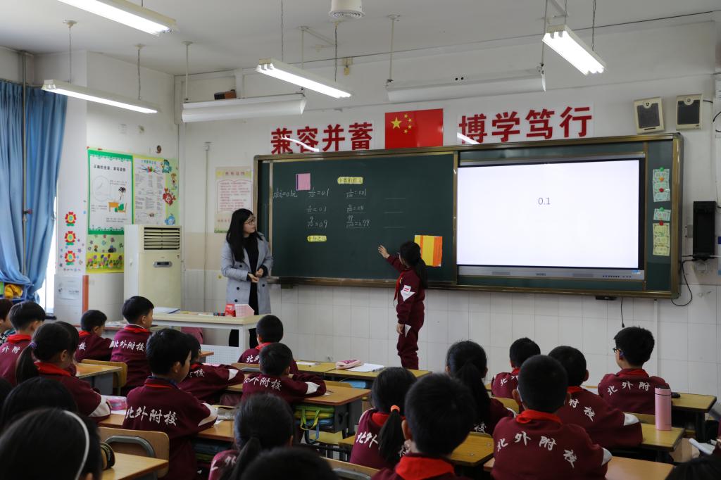 首先,大家观摩了四年级牛桂欣老师带来的《小数的意义(一)》一课。由抢红包的活动开始,激发学生兴趣,并通过生活中的小数现实模型,认识小数和十进分数的关系,之后再抽象到一般意义上的小数与十进分数的关系,使学生学会进行十进分数与小数的互化,通过找小数的活动,使学生感受并细化单位的必要性,并且在探究过程中建立小数单位,理解位值,培养数感。