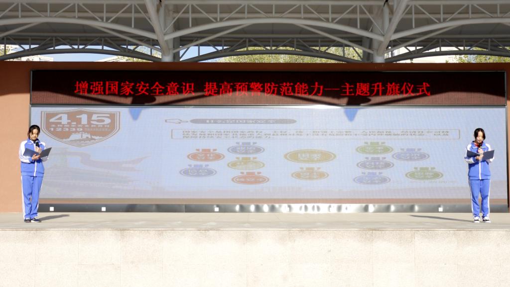 首先,主持人介绍了4月15日为“全民国家安全教育日”,并请高一(6)班许思嘉和庞瑾文做国旗下演讲,介绍关于国家安全的一些知识,使我们更加了解国家安全的相关规定。演讲共分5个部分:国家安全的定义,国家安全包含的内容,国家安全教育日的定义,危害国家安全的行为以及我们要如何维护国家安全。